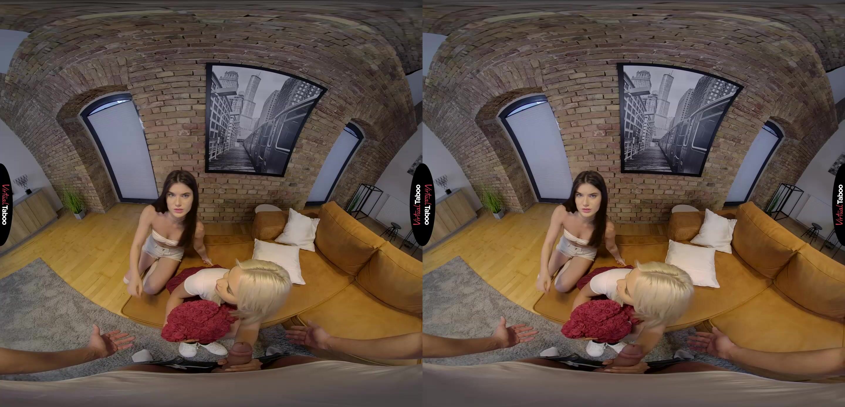Pretty blonde Lika Star VR comes home to find that her boyfriend has a surprise for her, a lovely stuffed bear covered in roses. She loves the gift and thanks you with something she knows you will love, a blowjob. You are happy to let her get to work with her pretty lips around your meat. Right in the middle of the fun, your stepsister Stefany comes in. She sees the bear and is instantly jealous. You never buy her anything like that. Stefany sees the way you are looking at her and decides that the girls should have a friendly contest. Whoever can get you off the best, can have the bear. Lika agrees and gets on her knees next to her friend. You feel just like the star of a VR Porn Scene as the two lovely young ladies using your cock as a prop. After they suck you, Lika lets Stefany gets fucked first. Stefany loves the way your big dick stretches her tight pussy and cums harder than she ever has with her own boyfriend. Lika can tell from the way you fuck her that her boyfriend is loving having two hot pussies at the same time. Trying her best to win the competition, Lika puts your cock in her mouth and sucks Stefany's cum from it. Not willing to lose, Sefany gets right up behind you and starts to eat your ass. You let them both suck you off, exploding all over their pretty faces. The bear has to go to Lika but you promise to buy Stefany another one if she will share your cock again.