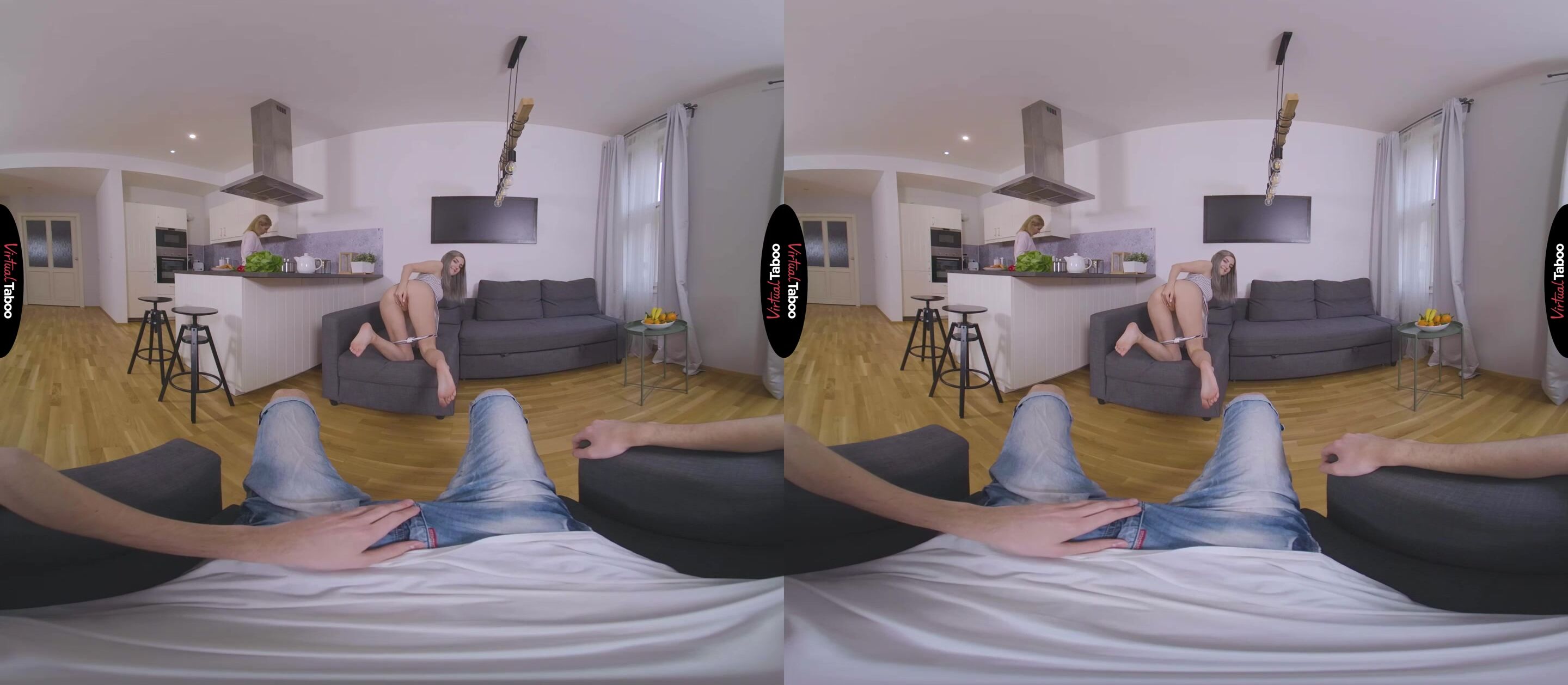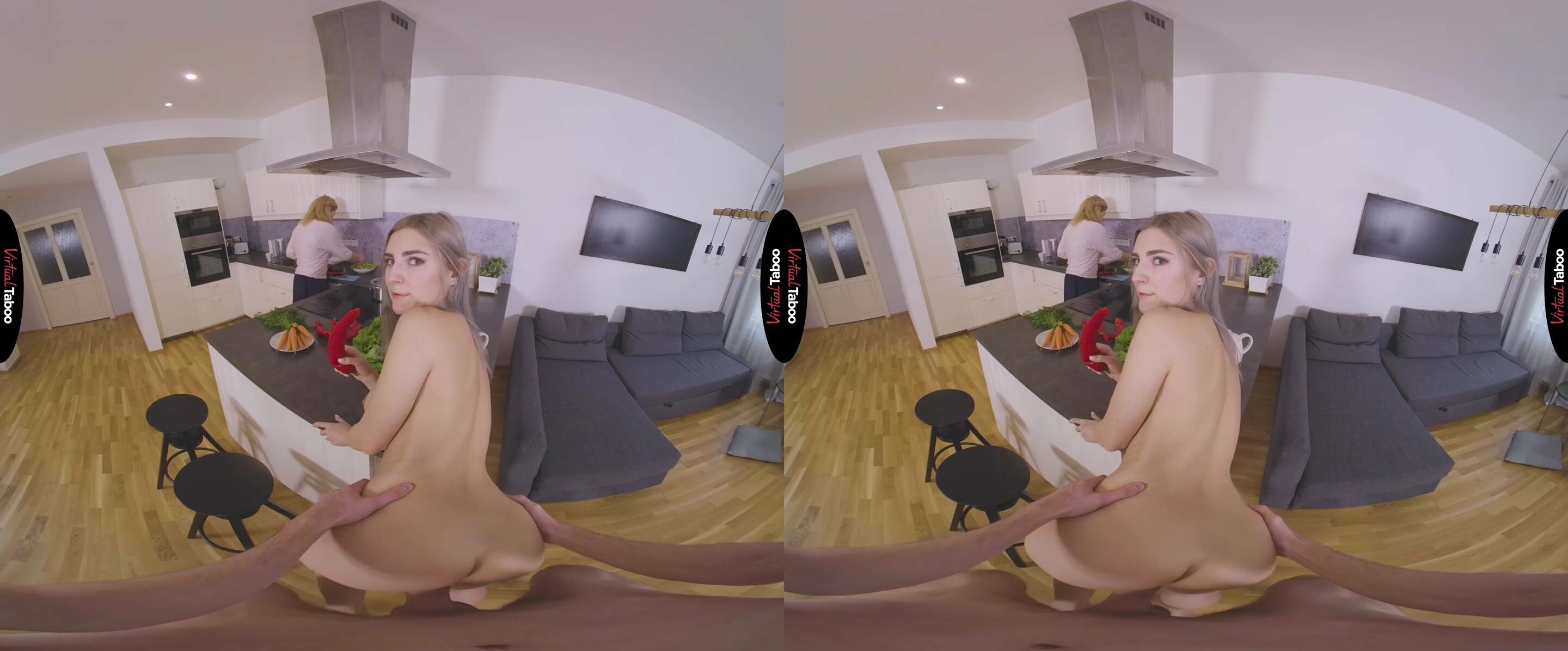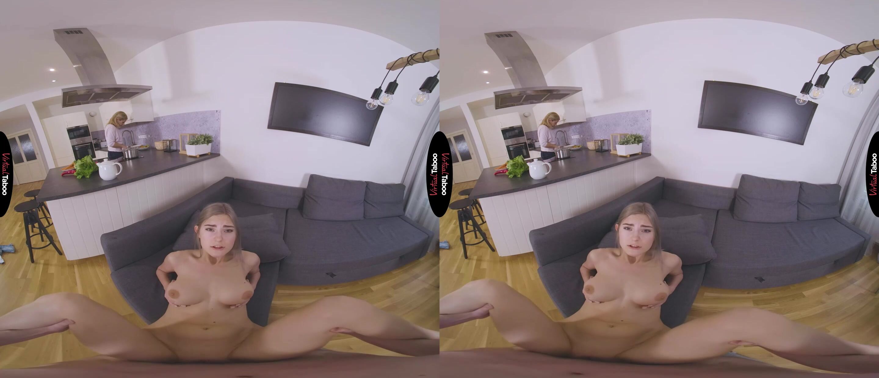 Eva Elfie is a very horny young VR pornstar. When she needs cock, nothing can get in her way. One morning Eva has her boyfriend over and her mother offers to fix them breakfast. They are happy to have the food, but Eva has other things on her mind and she cannot wait to have his cock. Using the counter to hide her actions, she lifts her skirt and shows him her ass. The playful flirting is fun, but Eva isn’t joking around. She needs his cock and doesn’t care how dangerous it is. Her boyfriend tries to play it cool, smiling at her mom even as Eva is flashing him a peek of her tight young pussy. As much as he wants her, he knows that her mother would be furious if she caught them. Eva knows it as well, but doesn’t care. She has to have his cock right now. Eva grabs a banana, peels it and sits in his lap. Her tongue circles the tip seductively as she teases him. She can feel his dick stiff in his pants and rubs her ass in his lap. He does his best to hold back, but Eva is not going to let him go without fucking him. She is as hot and horny as the young ladies in his favorite VR Porn scenes. He can’t resist when she replaces the banana with his cock and starts vigorously sucking every inch of it. The more she sucks, the hornier she becomes until she can’t hold back any longer. Lucky for them, mom is busy making breakfast, because he doesn’t stop pounding her tight slit until he has covered her shaved hold with his special sauce.