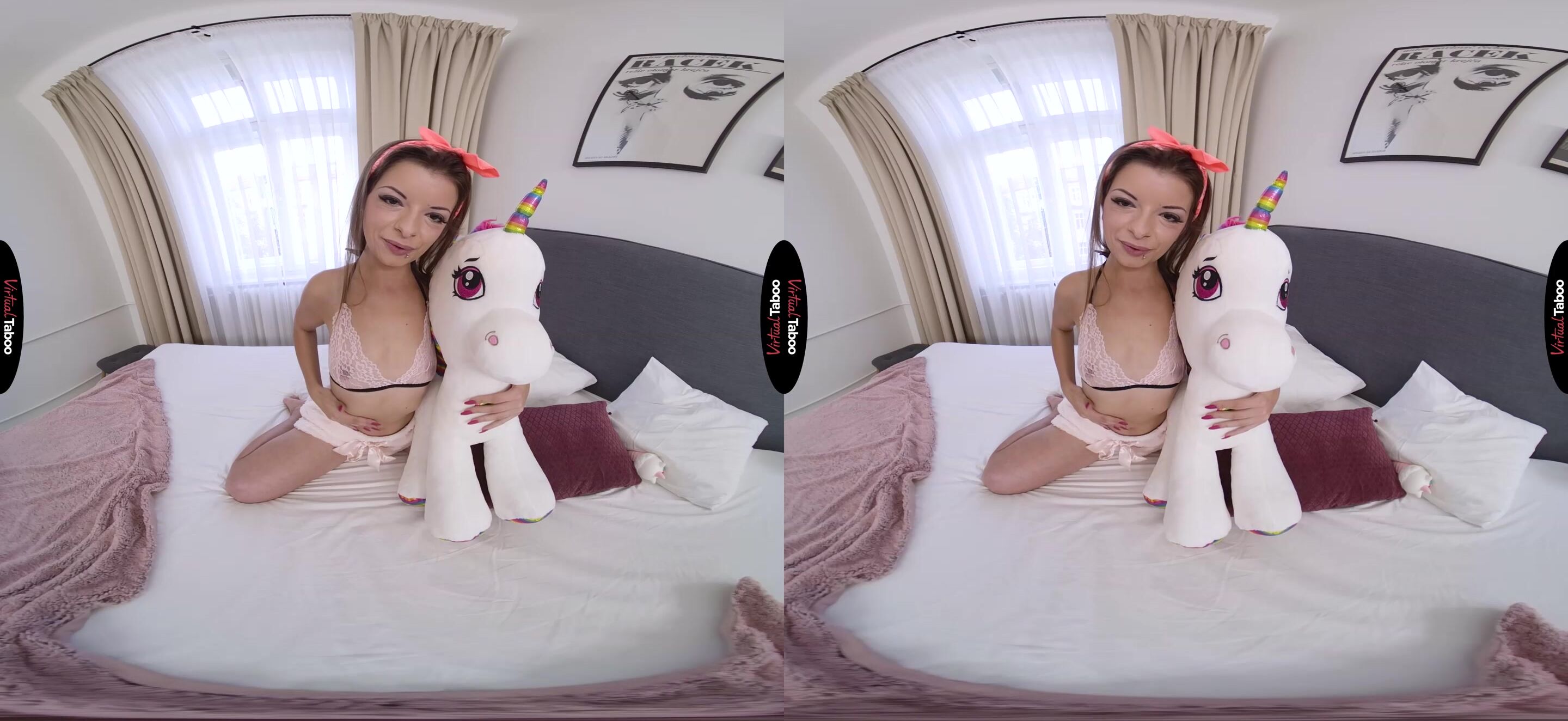 Ever since you and your wife had a family, you have been trying to improve relations with your stepdaughter. In order to please young Mary Jane VR, you decided to make her a small present - stuffed unicorn. When you arrive home, you find the daughter inside, dressed in a cute outfit. You are a little shocked. She has seen how you look at her when her mother is away and wanted to surprise you with a role-play VR Fantasy. Playfully hugging the stuffed animal, she rolls around the bed and teases you about fucking her. It can just be your secret, she won’t tell your wife. You have never seen her this playful and she looks really good in the cute outfit. She teases you, giving you just a peek at her breasts will still playing innocent and talking to you in her naughtiest voice. She is so lonely with only her stuffed friend to take care of her. Humping her toy, she pulls down her shorts and begs you to give her what she really needs. She tells you to take out your cock and watch as she uses a rubber ice cream cone from the unicorn to satisfy her horny pussy. You stroke at the same pace she uses as she pushes the colorful toy in and out of her wet, pink folds. Sexy Mary Jane smiles as she cums hard and invites you into bed to join her for round two.