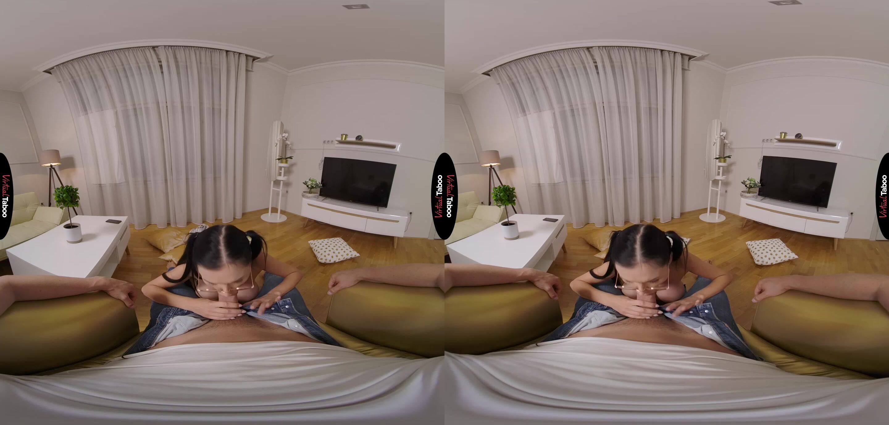 Sasha Rose is nineteen years old and tired of being treated like a small girl. Her parents are gone and left her brother strict instructions not to let her go out. When he got the chance to see his girlfriend, he left the house, asking his best friend to make sure that Sasha didn’t go out. Bored and looking for a way to get away to meet up with her friend, Sasha notices her brother’s friend secretly checking her out. In this VR porn scene, she decides that this is her best chance to get out of the house and starts teasing him. It doesn’t take too long before she has him right where she wants him. Sure he can see more. In fact, he can do anything he wants as long he promises to let her go out and then keep it a secret. She playfully pulls out her tits and shows them off. As much as he wants to be a good friend, Sasha looks as good as any girl in a VR Sex Scene and she is all his if he wants her. When she has his word, Sasha grabs his cock and starts sucking. She knows what she is doing and loves how big and hard his dick gets in her mouth. Forgetting about meeting her friend, Sasha stops sucking and strips naked. She needs to feel that big meat inside of her. It feels huge when he slips it in from behind. It has been a long time since Sasha has been fucked this well. She rides him until he can’t take it anymore and then sucks a big load from his dick all over her face. The freshly fucked teen is still going out, but she makes him promise to fuck her again when she gets home.