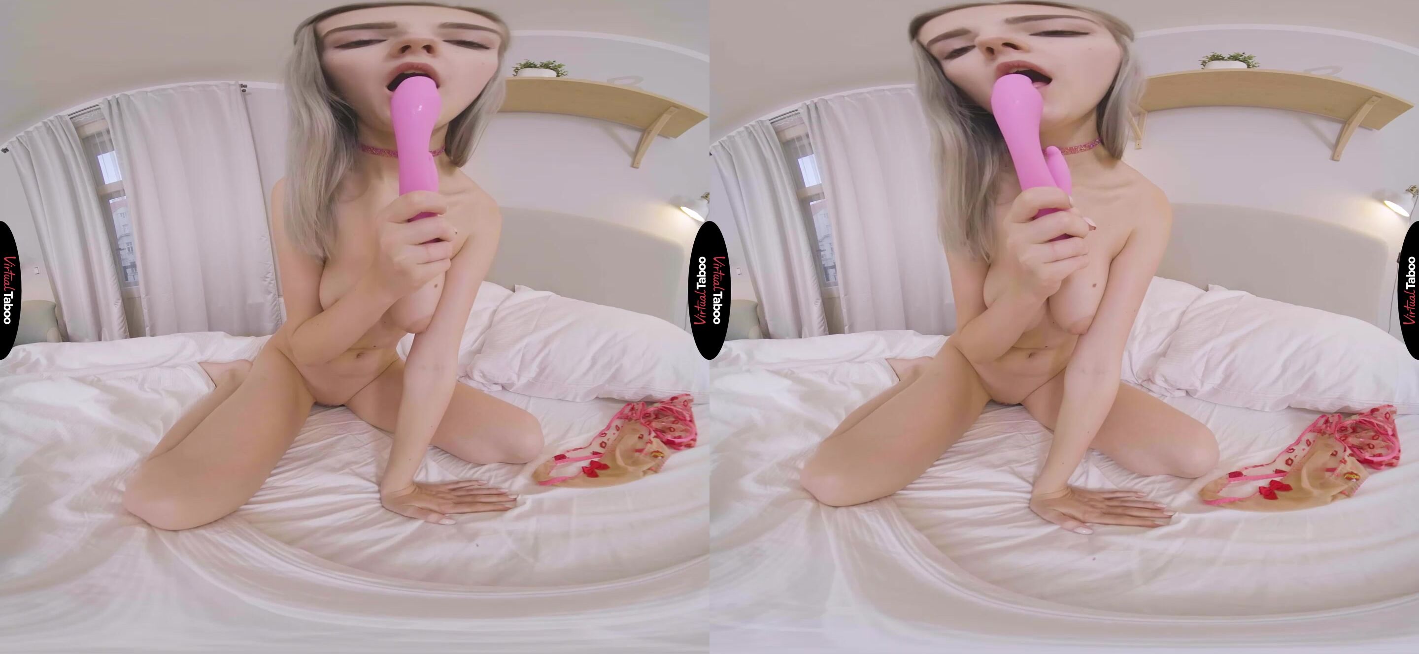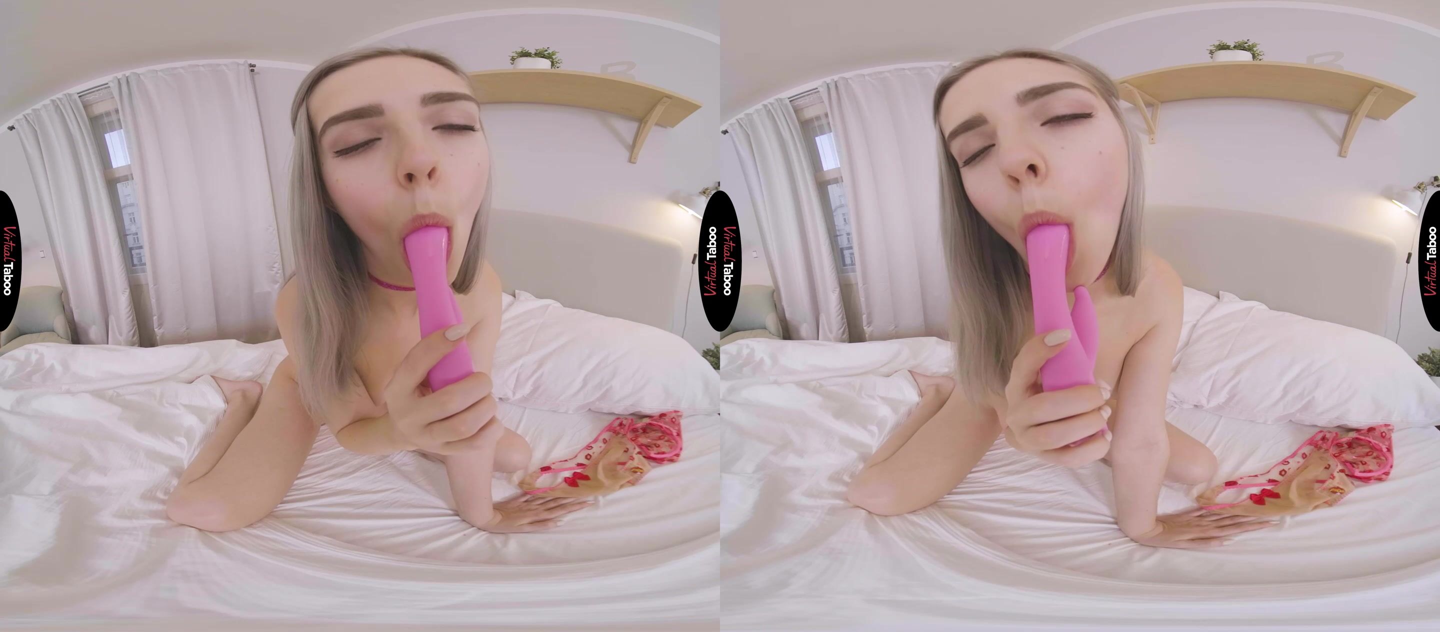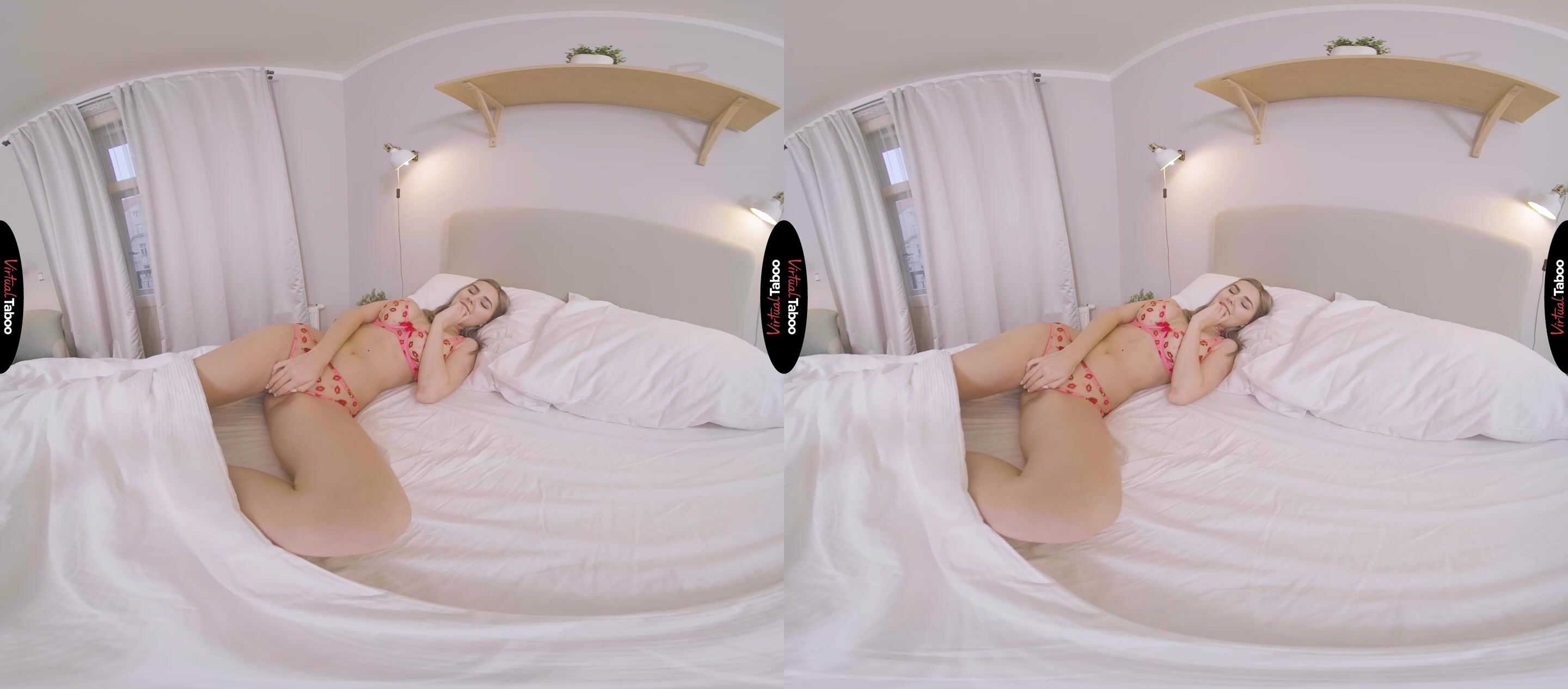 With everyone stuck home, Eva Elfie really misses her boyfriend in this VR porn solo scene. They talk on the phone every night and video chat when they can. Still, she misses his kisses and his big cock inside of her. Worried that he might forget about her, Eva decides to take some special pictures for him. She was saving a cute bra and panty set for a special occasion but decided it was the perfect time to try them on. The sheer martial is nearly see-through with little red kiss lips all over them. Eva sets up her camera and takes a few test shots. She loves the way the sexy clothes look on her lithe young body. These photos have to make her boyfriend so horny that he can't to come rushing over as soon as he can and fuck her tight holes. She tried to imagine her boyfriend at home looking at the pictures, taking out his cock and stroking it. Imagining him touching himself made Eva even hornier and by the time she took her panties off to show him her pink pussy, it was dripping wet. She stared into the camera and slipped her fingers inside, dreaming of when she could stop pretending and actually feel his cock in her. Picturing him stroking and exploding in his hand pushed Eva over the edge and she came all over her fingers. It wasn't as good as the real thing, but it would have to do for now.
