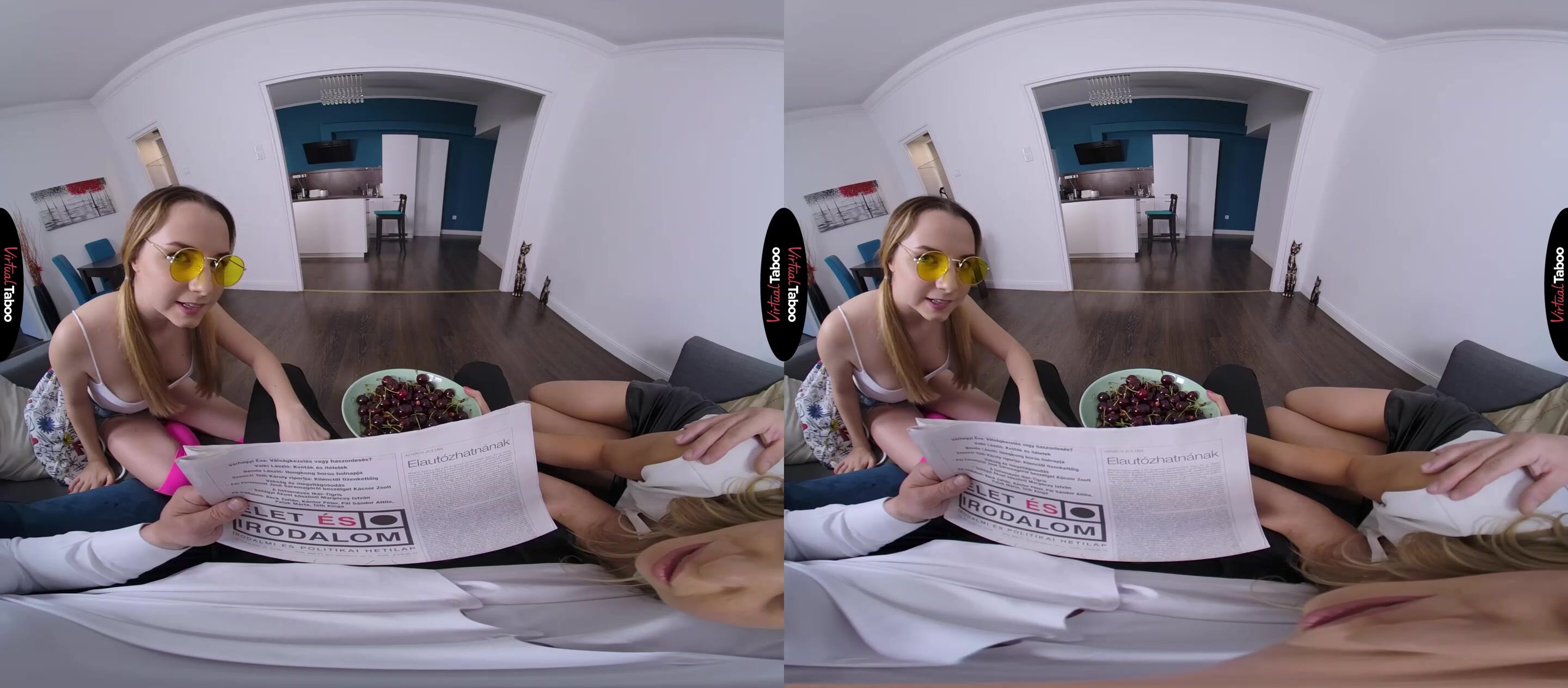 Today's VR Porn Series episode features a happy family on a lazy morning. Nikky Thorne is enjoying a bowl of cherries while her husband is reading his paper. Their stepdaughter, Mona Blue is home from college, bored, and turned on from watching porn on her VR Headset. She decides to tease her stepdad a bit. With his head in the paper, he cannot tell who is playing with his cock. He thinks that it feels a bit like a VR Porn Movie with his paper taking the place of his VR Goggles. Mona's hands make his cock hard before anyone realizes what she is doing. When Nikky sees what the daughter is doing, she is shocked. Daughter sucking father's cock. It is like something out of one of the VR Porn Scenes they watch together. When just like a Virtual Reality Porn fantasy, she decides to join the horny daughter for a double blowjob. When he feels two mouths on his dick he finally figures it out. Looking at his wife and daughter giving head like slutty VR Porn Stars is too much. He just has to fuck them. Thanks to your VR Headset you can step into his shoes as he bangs Mona's tight twat. Mona helps father fuck Nikky but accidentally guides his cock into mom's ass. It is a tight fit, but she promises to help Mona try it in the ass next time. This is the kind of hot High Definition Virtual Reality smut that you only get in VR Porn Movies. Come make your horny three-way dreams come true.
