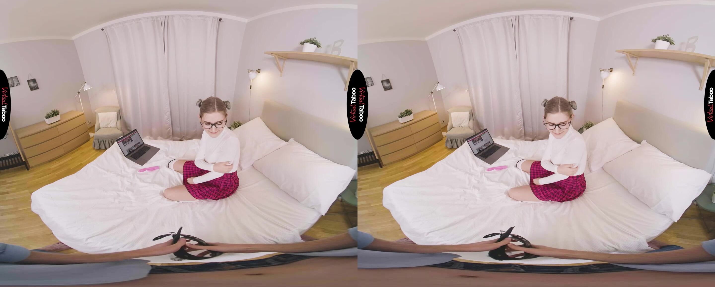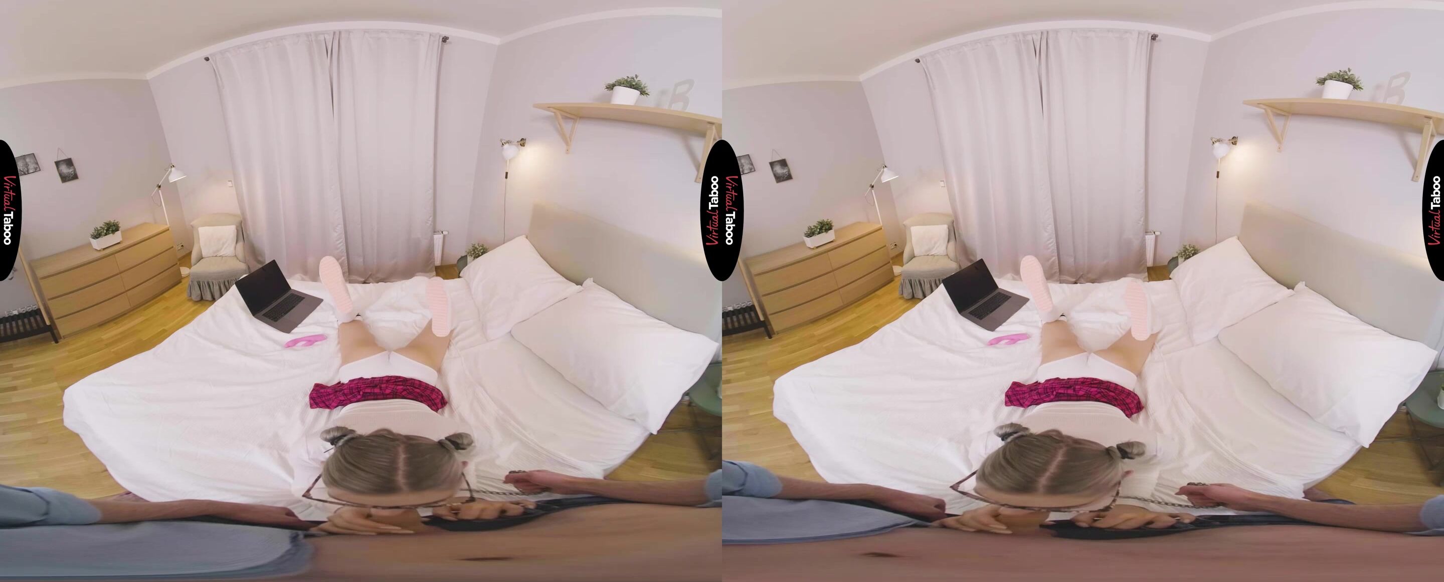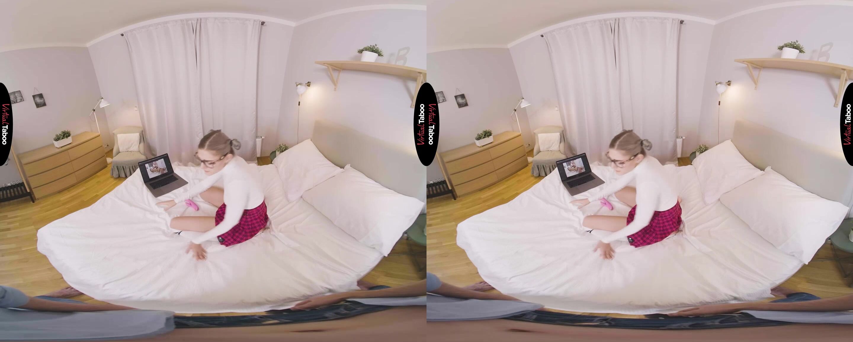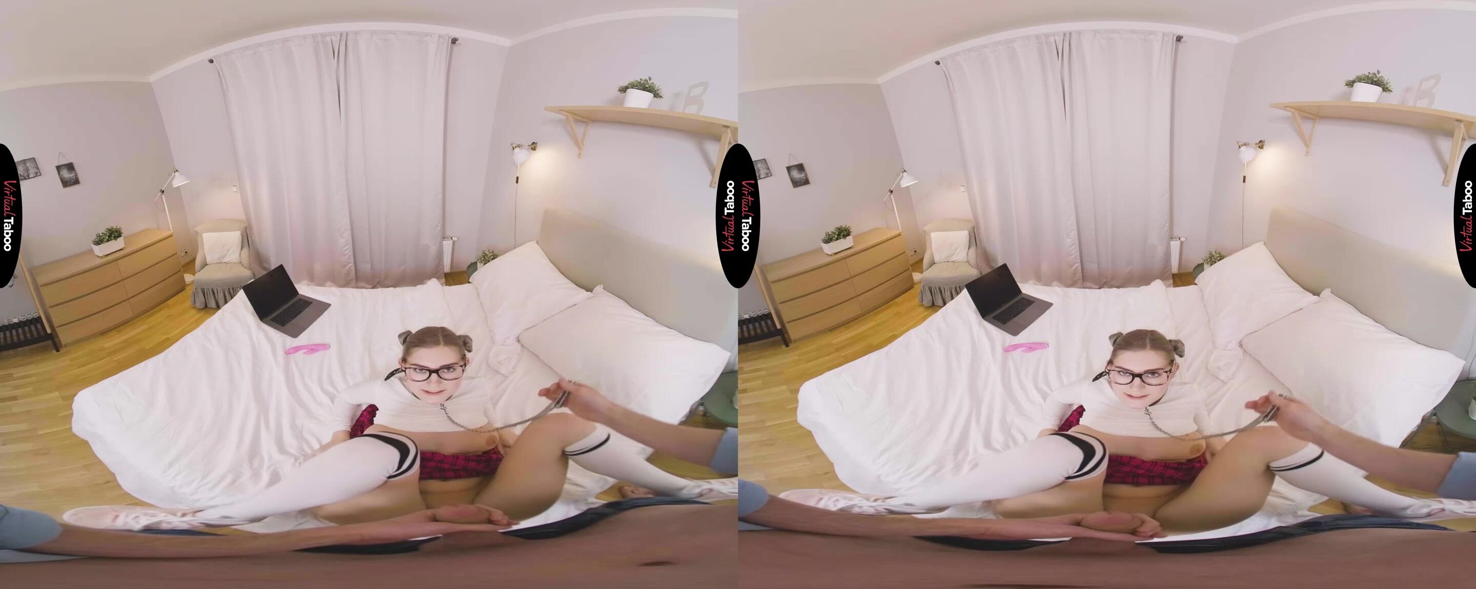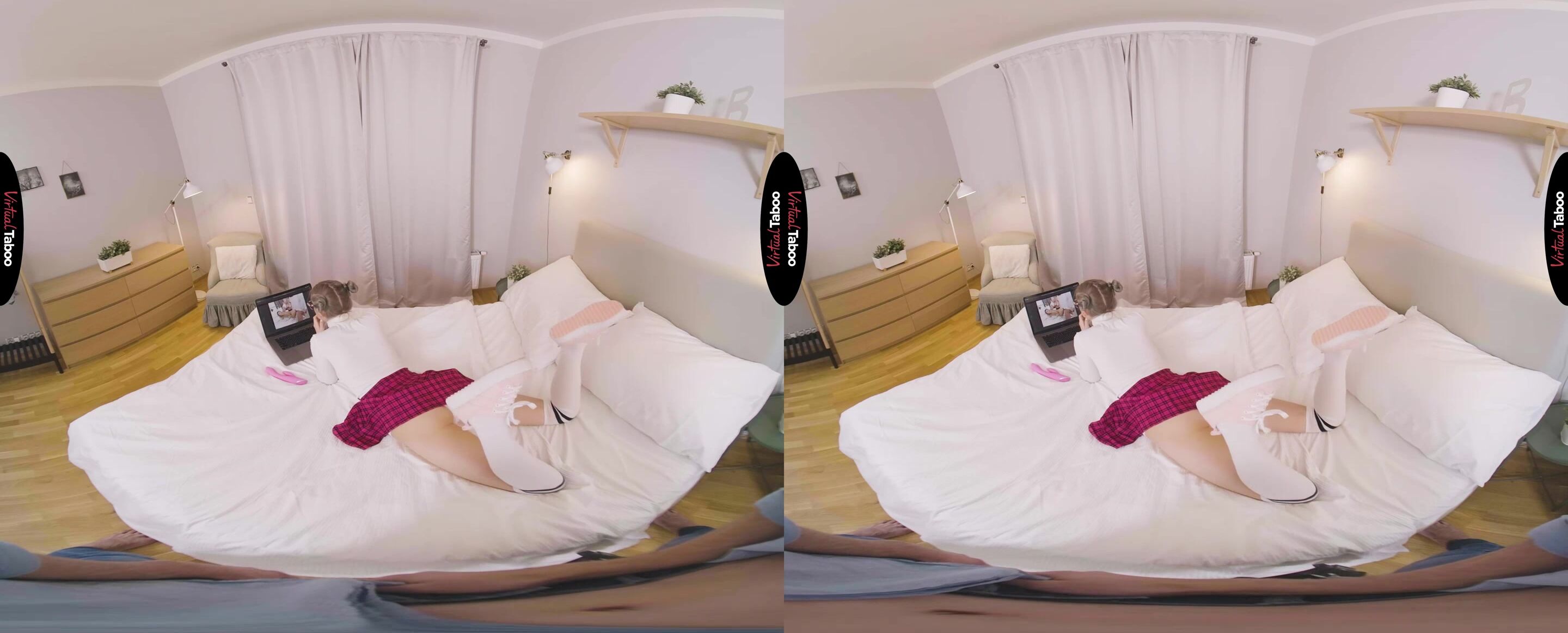 Eva Elfiе has a naughty habit. She loves VR taboo рorn and she races home evеry day to watch the latest Virtual Tаboo scene in 7K. While masturbating to the forbidden family fantasies she imagines being fucked by her stepbrother. One afternoon, right in the middle of rubbing herself to a new scene, brother catches her. He stays silent, watching quietly as she uses her favourite vibrator on her horny pussy. The discovery is fortuitous as he has been harbouring fantasies about cute sister for some time. He sneaks off to his room and returns with a special surprise. This time Eva hears brother and tries to kick him out of the room. He stays and Eva notices that he is holding a leash and looking at her with lust in his eyes. Eva cannot believe it. Her naughty fantasies are going to come true. She feels the collar around her neck as brother tugs on the leash and pulls her face to his crotch. She feels his hard meat through her pants. This is exactly what she has been fantasizing about every day after school. She instantly feels submissive and obeys his commands. His cock is the biggest she has ever seen. It is wrong, but Eva love being brother's submissive sex pet and worshipping his big dick. Sister begs him to turn her around and fuck her dripping wet pussy from behind. The sound of the chain clinking and the tug of the collar feels almost as good as his big cock stretching her little twat. The harder he fucks her, the happier she is. All of her dirty fantasies are coming true and as he explodes cum all over her face, Eva knows she will be rushing home for something new from now on.