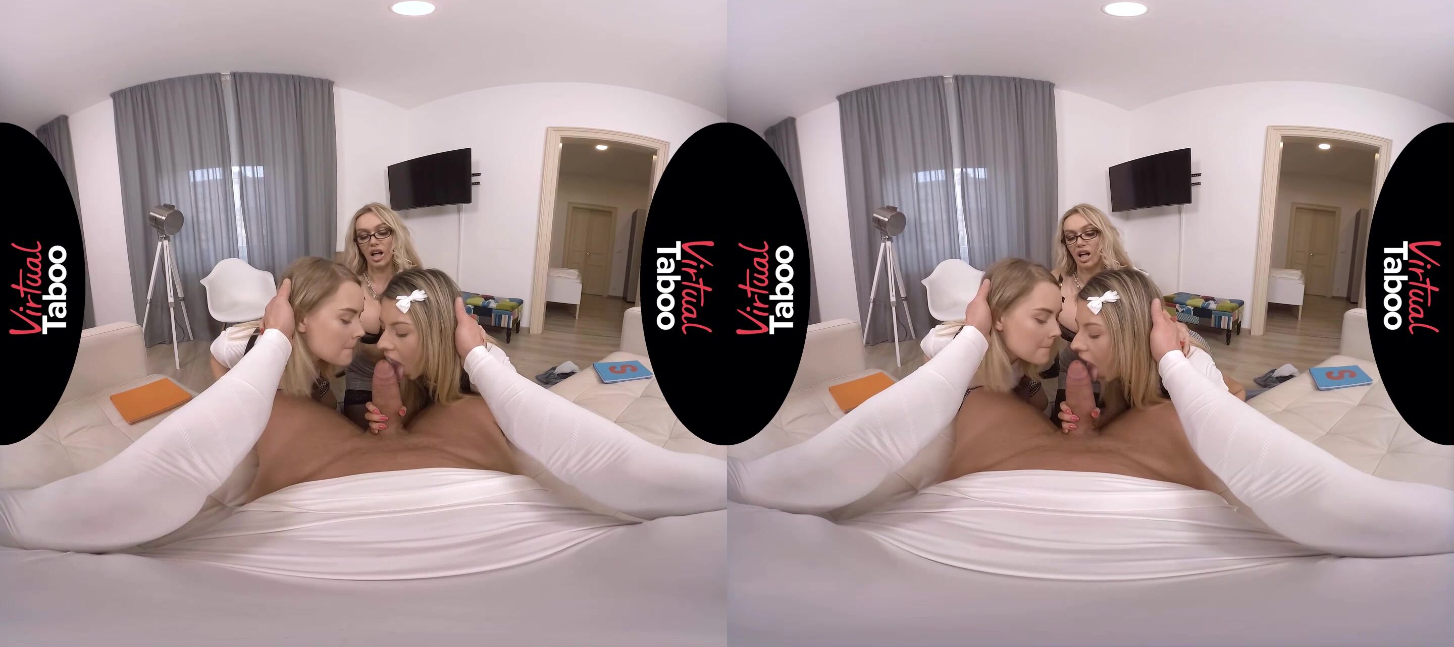 Stern tеacher Amber Jayne has had enough оf rebellious student Rebecca Vоlpetti and her in-school antics. After сatching Rebecca and her friend Emily kissing in the girls' restroom, Amber decides to pay a visit to Rebecca's home. She begins to explain the situation to Rebecca's stepfather and notices him staring at her. His lustful looks and the story about her students kissing has Amber getting more and more turned on. As she flirts back, she notices his cock growing in his pants and Amber just has to have some of that for herself. She pulls it out and starts licking the head, finding that he has no objection to getting a blowjob from daughter's beautiful teacher. Rebecca and Emily come home to find Amber with her mouth full of cock. She quickly talks the girls into joining the fun and Rebecca's stepfather is happy with the arrangement. The two young blondes share his big cock while their busty teacher encourages them. Soon the lucky guy has all three hot babes passing his dick back and forth. Moving to the bed, Rebecca gets to try out father's dick in her pussy. She has had a crush on him for a long time and finally get to live out her fantasy. When Amber gets her turn, the two sexy students get a chance to recrate the kiss that got them in trouble in the first place. No one seems to mind any more. They just keep kissing while he takes turns fucking three very horny pussies. Amber takes control of his cock at the end, showing her students just how to make a many happy. She strokes and sucks his cock until he explodes all over her face. This may require several more after school meetings to resolve.