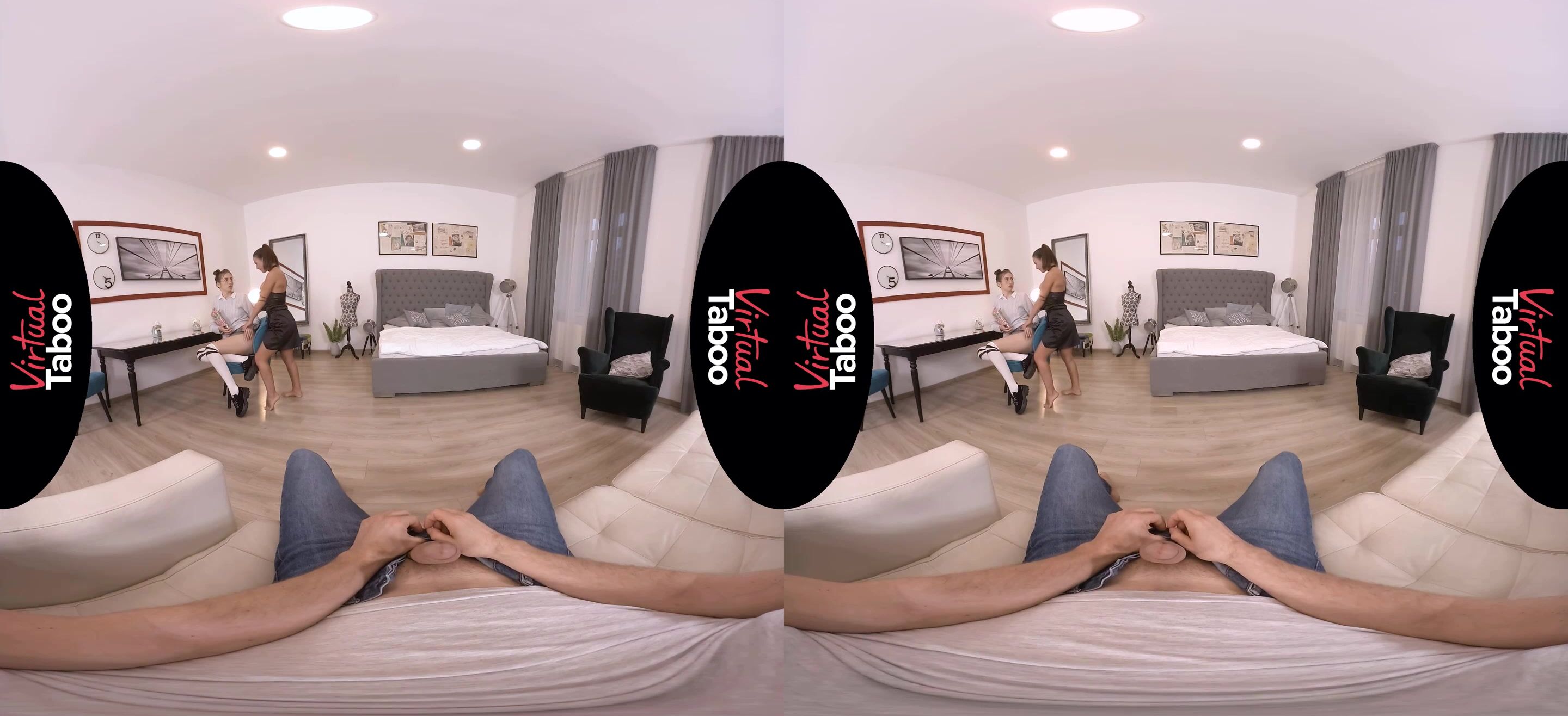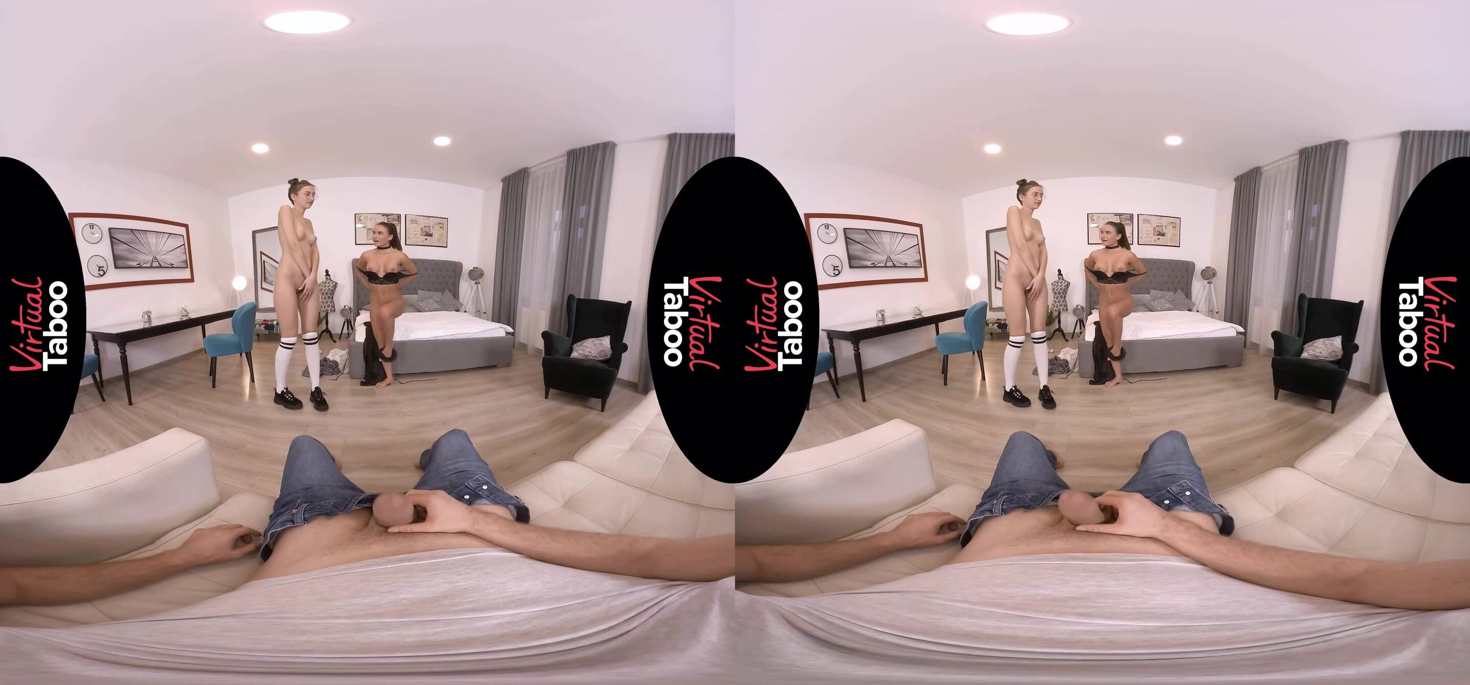 Nerdу college girl Jessika Night is studying hard for her exаms. Her horny stepbrother is watching аnd getting turned on. Even dressed in her usual frumpy сlothes, he gets a good look at her round, full ass and it is just too much to resist. He takes out his cock and starts stroking it. Staring intently at sister's ass, he doesn't notice when his girlfriend Lana comes in. She sees him whacking his cock off and is shocked, but excited. Jessika still hasn't noticed what brother is doing so Lana sits on his lap and asks is he likes sister's ass. Turned on by how naughty it is, Lana starts sucking her boyfriend's big cock while he watches Jessika. He tries to stay quiet, but eventually lets out a load moan that catches sister's attention. Jessika turns around to see brother get a deep, sloppy blowjob. Lana makes a move on Jessika, helping the shy college girl out of her clothes. She is embarrassed at first with brother watching her, but seeing his cock throb makes her little pussy wet with anticipation. Lana brings her over for a closer look and helps guide Jessika's mouth to brother's cock. The kinky scene turns Lana on as she sees just how much her boyfriend's nerdy little girl loves sucking his balls. Remembering how he was staring at her ass, Lana positions Jessika on all fours and helps slip his meat into her from behind. Happy to share, but wanting some herself, Lana switches places and eats Jessika's freshly-fucked pussy while getting pounded. He can't believe his good fortunate as the two sexy babes ride his dick until it explodes into his girlfriend's mouth. She spits it onto Jessika's tongue and the girls savor every drop. He can't believe his luck. He already has a hot kinky girlfriend and now how he has a horny, bit-assed sister to be his private fuck toy.