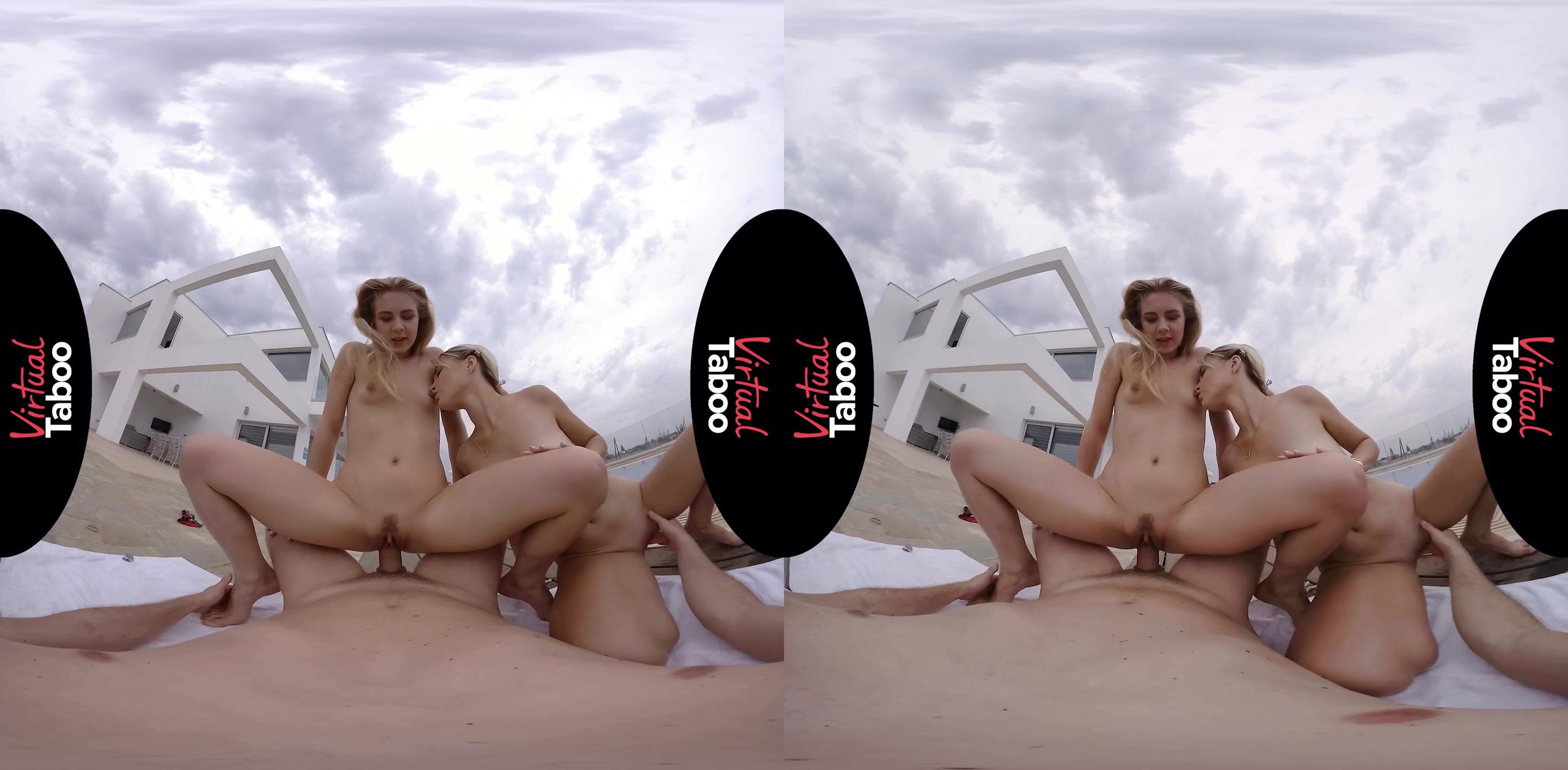 Mashа loved spending time with her cute friend Aleciа Fox. They got along well and a lоt in common, but mostly Masha liked hanging out with Alеcia to relax in the pool. Having a friend with money was nice, especially on long hot summer days. There were other benefits as well. In addition to the pool and nice house, Alecia had a hot older stepbrother who Masha couldn't stop fantasizing about. Whenever possible she flirted with him and teased him, knowing that her half naked body would capture his attention. It came as no surprise one day when Masha saw the big bulge in his pants. What did surprise her was the way Alecia was staring at it and licking her lips. Realizing that they both want the same thing, the girls float over to him and try to get him to come into the pool. He refuses, trying to hide his hard on from them. The girls get out of the pool and sit next to him, teasing each other and letting their hands graze the throbbing bulge in his shorts. Knowing exactly what they want, they take out his cock and kiss the head. The two young sluts pass it back and forth, sucking him deeply and slobbering all over his meat. Watching sexy sister and her slutty friends take turns sucking his cock drives him crazy and he is down for anything the girls want. What they want is to ride his thick dick and fill their pussies with it. Masha enjoys sucking his dick right out of her friend's pussy and then eating her to a loud orgasm. Watching her best friend fuck brother, Alecia just can't wait for a second turn. He pulls out and showers the sexy teens with a load cum. Alecia and Masha share the sticky surprise knowing that they are more than just friends from now on.