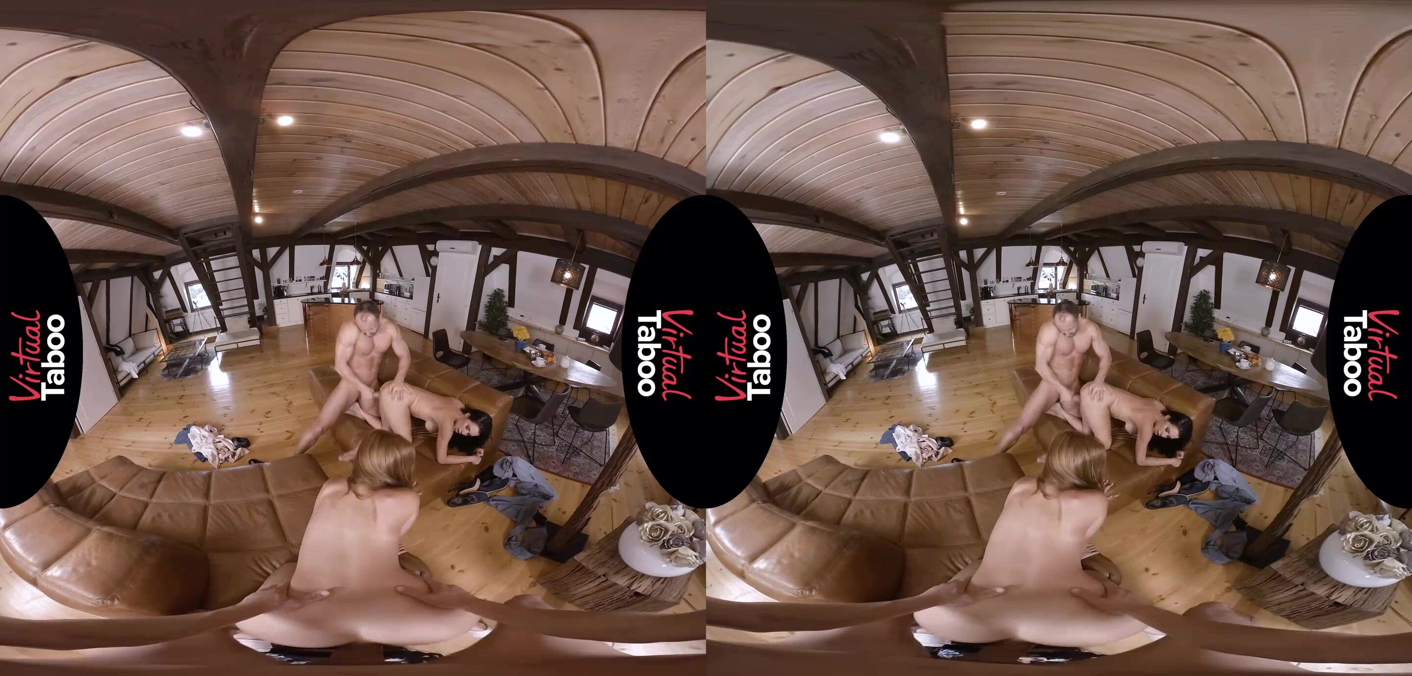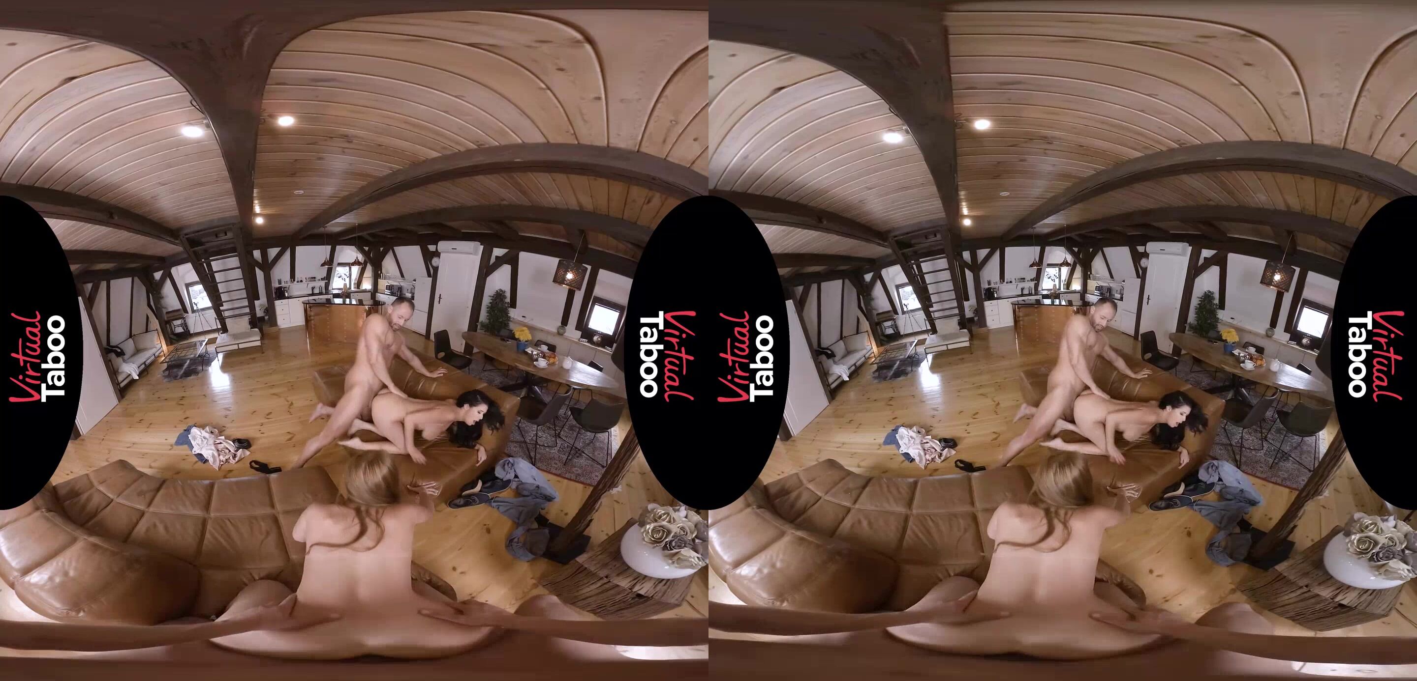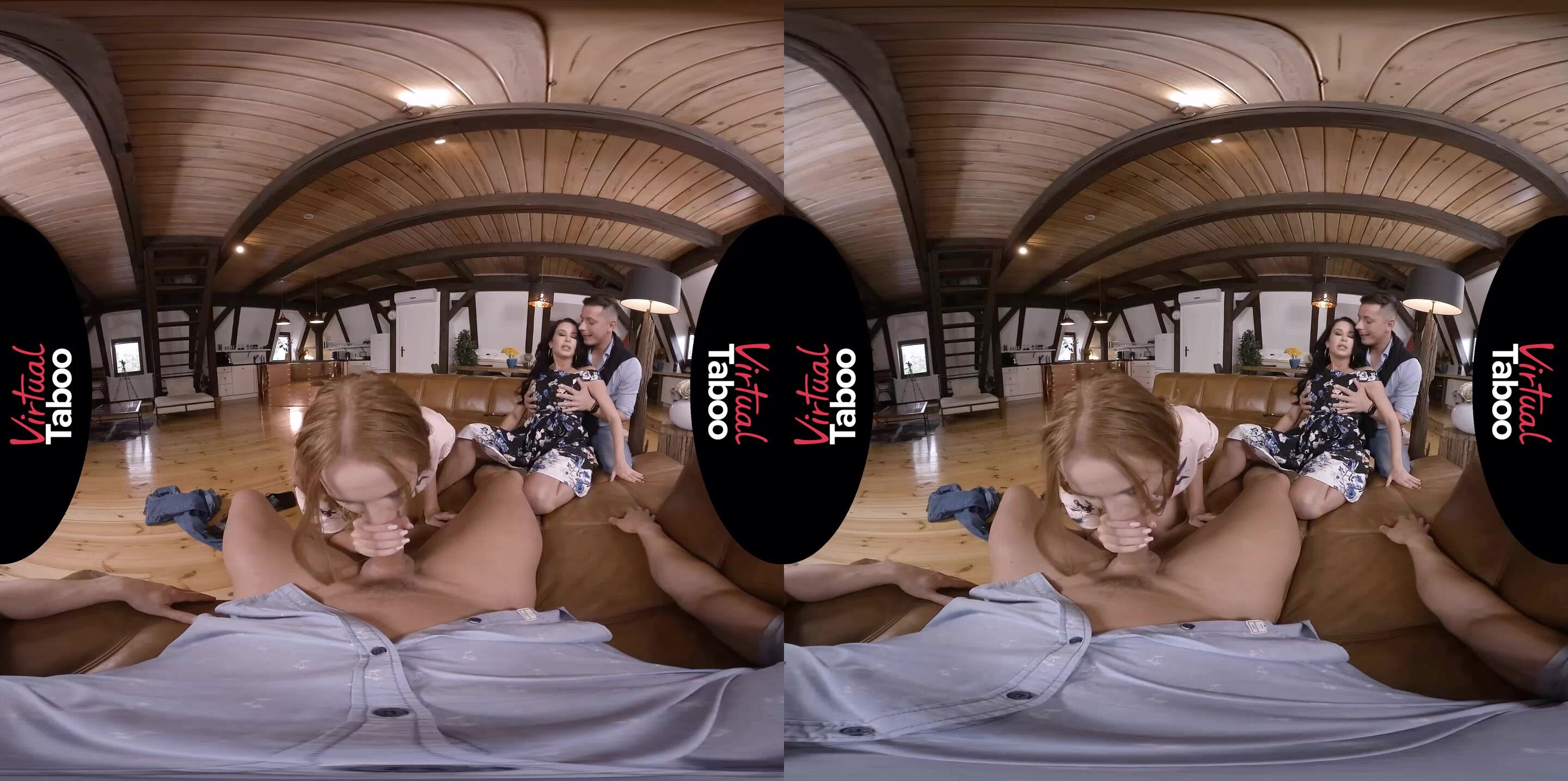 On a relaxing afternoon, cute college teen Kaisa Nord is spending some time video calling her boyfriend while her stepfather relaxes on the couch. Her mother is enjoying some tea with her new stepbrother. Kaisa starts to tease her boyfriend by showing him a little bit of skin. This catches the attention of dad who can't help but notice how sexy his stepdaughter is. It doesn't take her long to notice him noticing or the bulge growing in his jeans. Kaisa has had a crush on her new father ever since the wedding and isn't about to let the chance pass. She moves closer and pulls his cock from his pants. Using the couch as cover, she drops her mouth onto his dick and starts sucking. The risky sex is a turn on for dad, but when mom needs to go to the bathroom she walks right past the obscene action. Shocked at first, Veronica soon finds motivation in her anger. She also feels son's hands on her breasts from behind. Two can play at this game. Spreading her legs wide, she enjoys his tongue while criticizing her daughter's oral skills. "You have much to learn, let me show you how it's done." Veronica greedily sucks on son's cock, giving daughter lessons in how to be a true slut. While sitting on daddy's dick, Kaisa leans over and gets a second in her mouth. If daddy gets to try new pussy, mommy gets fresh dick. Veronica is happy to show them all how it's done, bending over and taking his young hard dick into her big round ass. This lesson will have to wait for next time as she and Kasia suck both dicks dry with their mouth. Certainly, this will be the first of many family fuck days.