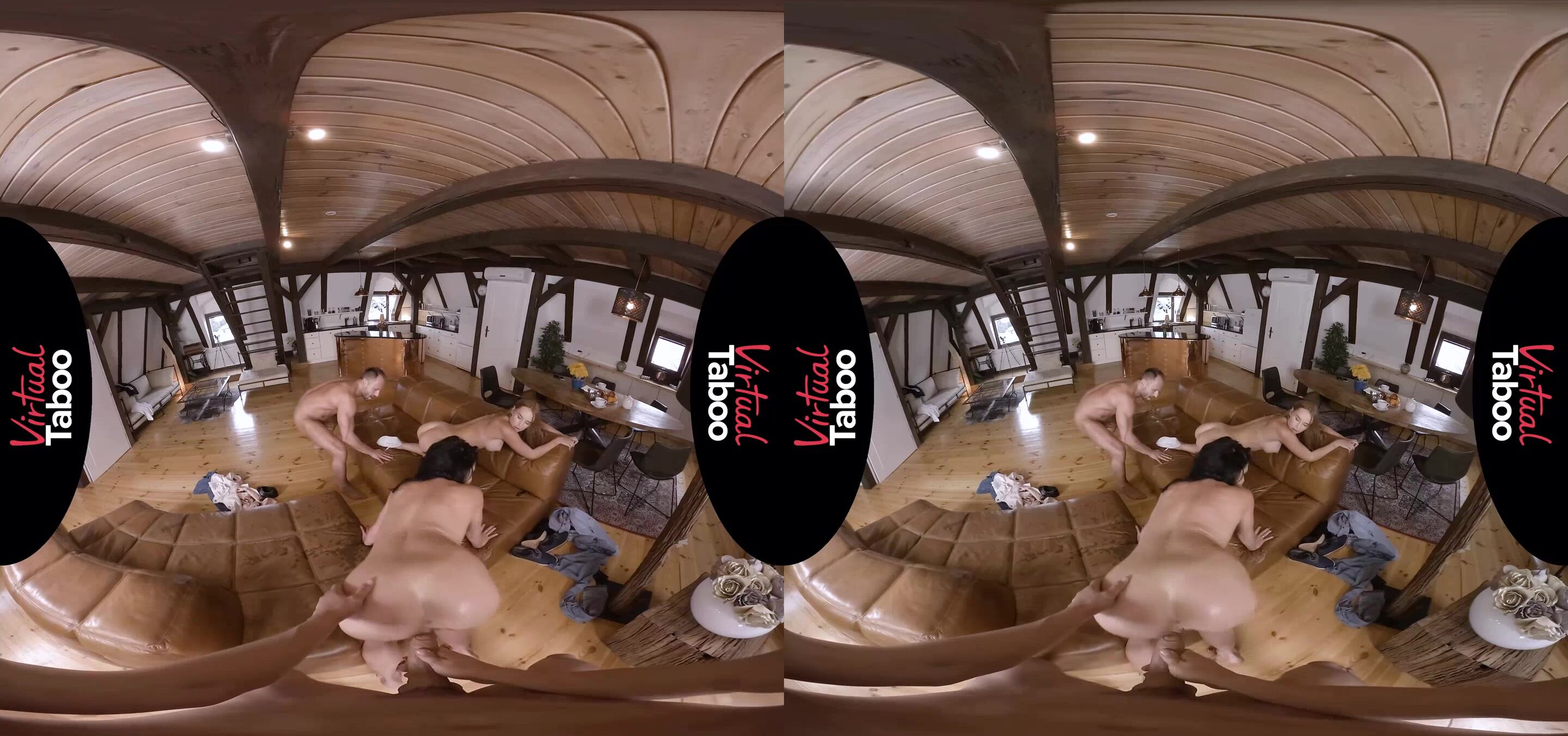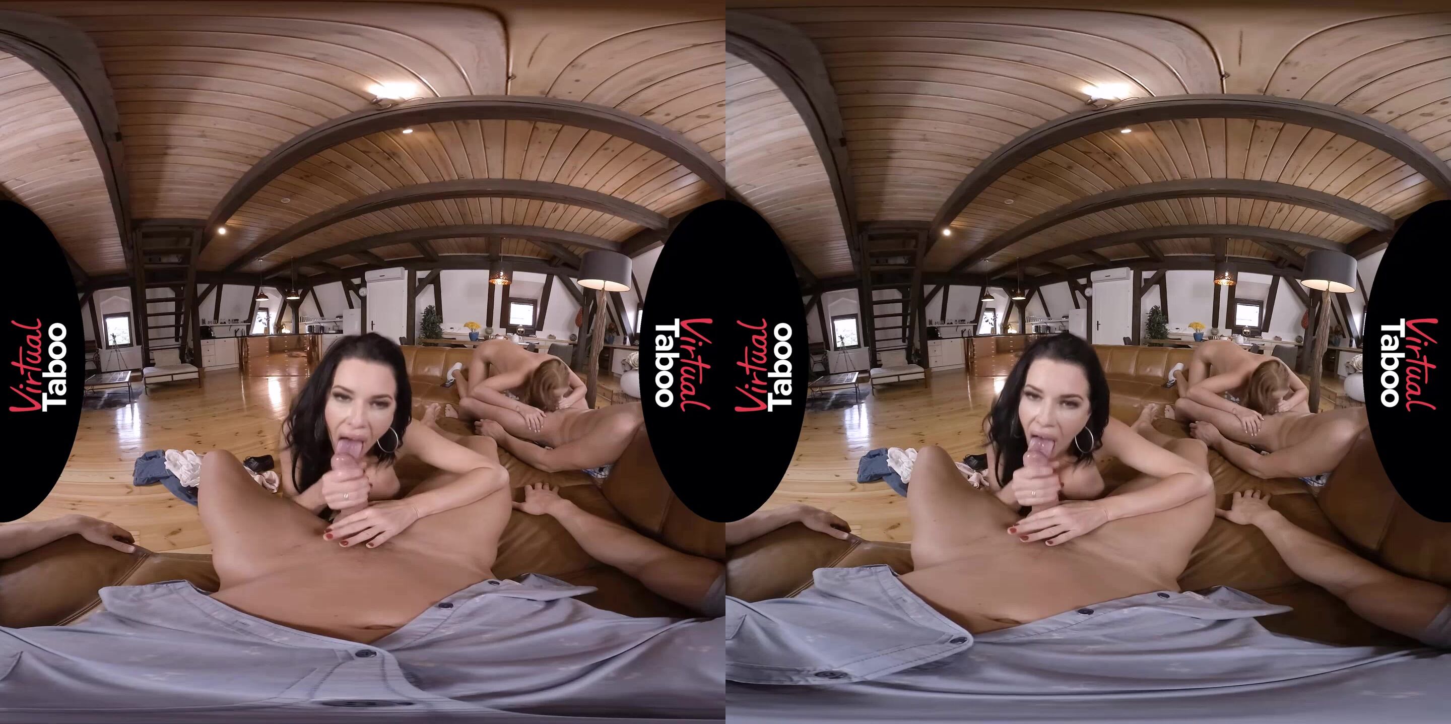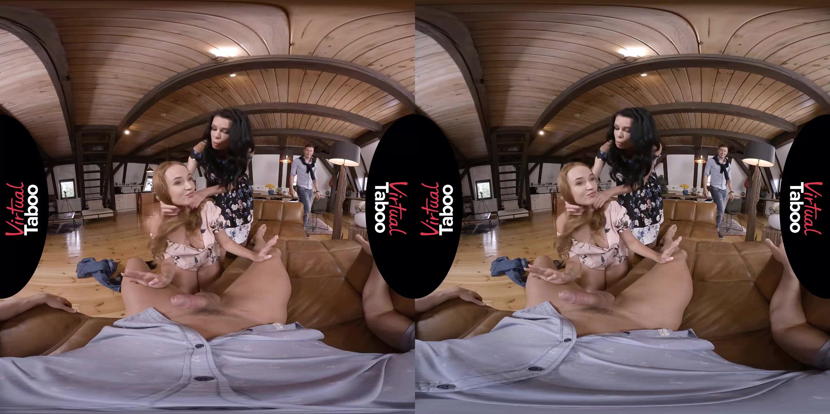 On a relaxing afternoon, cute college teen Kaisa Nord is spending some time video calling her boyfriend while her stepfather relaxes on the couch. Her mother is enjoying some tea with her new stepbrother. Kaisa starts to tease her boyfriend by showing him a little bit of skin. This catches the attention of dad who can't help but notice how sexy his stepdaughter is. It doesn't take her long to notice him noticing or the bulge growing in his jeans. Kaisa has had a crush on her new father ever since the wedding and isn't about to let the chance pass. She moves closer and pulls his cock from his pants. Using the couch as cover, she drops her mouth onto his dick and starts sucking. The risky sex is a turn on for dad, but when mom needs to go to the bathroom she walks right past the obscene action. Shocked at first, Veronica soon finds motivation in her anger. She also feels son's hands on her breasts from behind. Two can play at this game. Spreading her legs wide, she enjoys his tongue while criticizing her daughter's oral skills. "You have much to learn, let me show you how it's done." Veronica greedily sucks on son's cock, giving daughter lessons in how to be a true slut. While sitting on daddy's dick, Kaisa leans over and gets a second in her mouth. If daddy gets to try new pussy, mommy gets fresh dick. Veronica is happy to show them all how it's done, bending over and taking his young hard dick into her big round ass. This lesson will have to wait for next time as she and Kasia suck both dicks dry with their mouth. Certainly, this will be the first of many family fuck days.