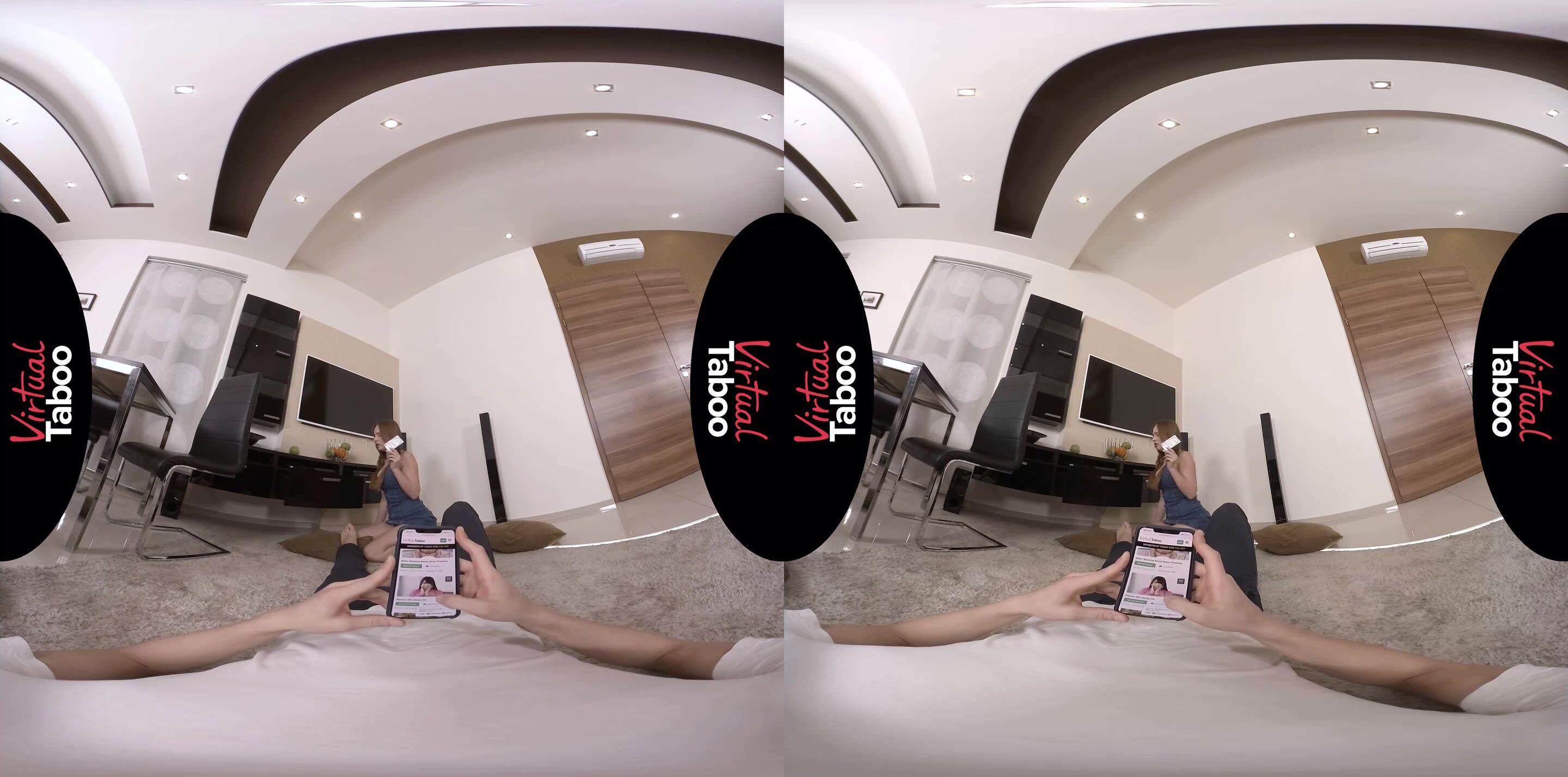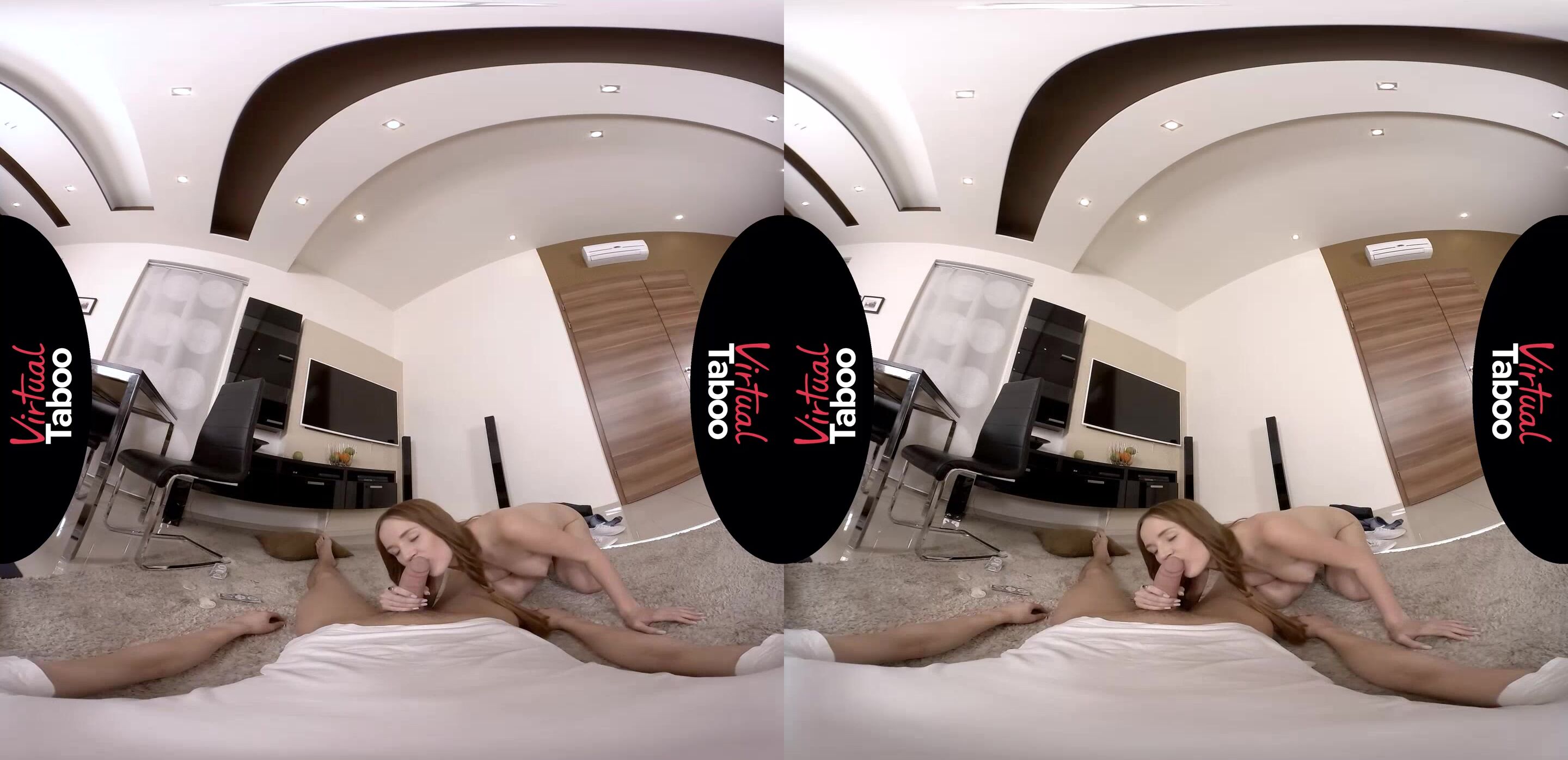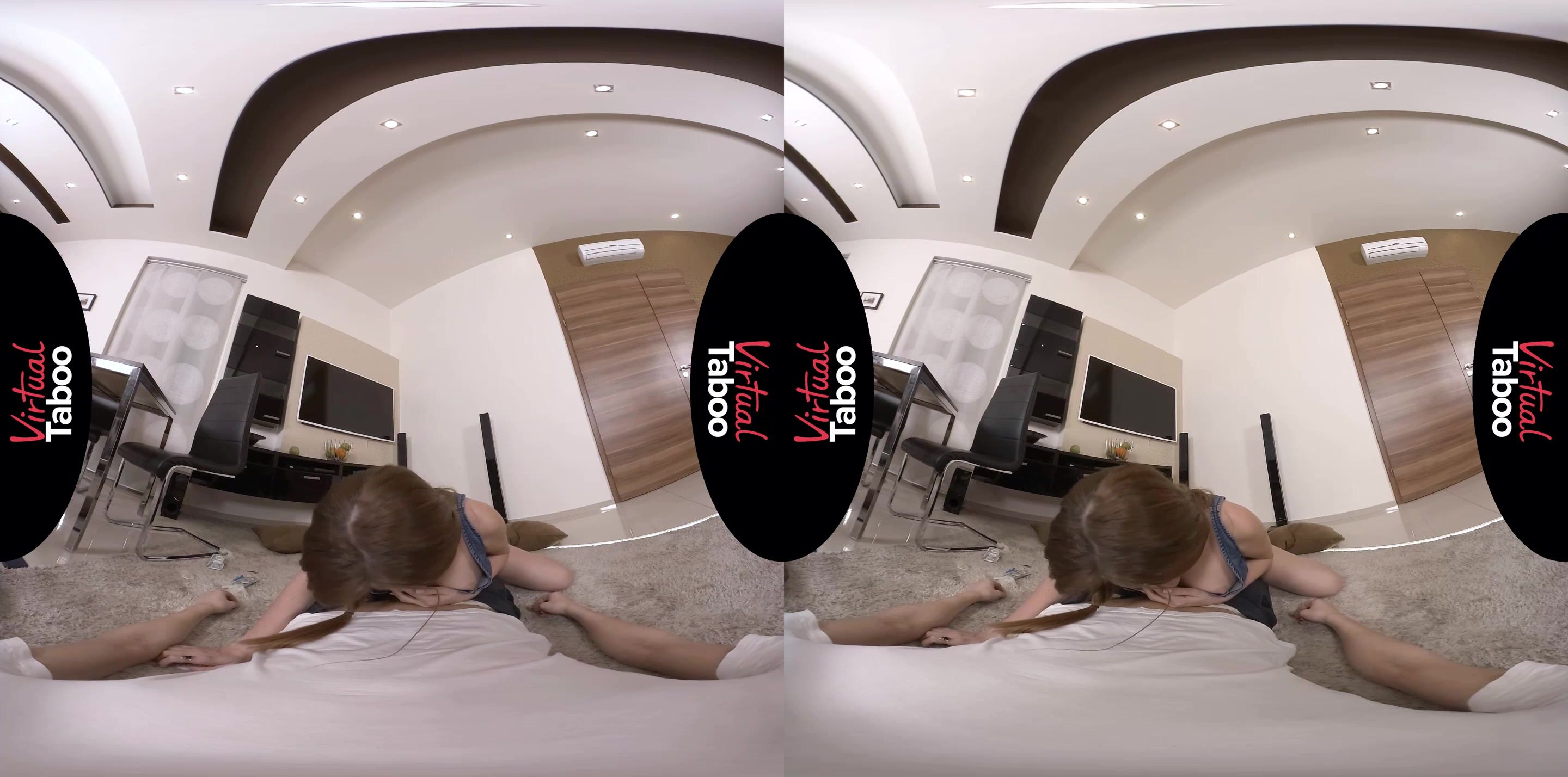 Tired of watching chick flicks, this horny stepbrother takes control of the remote and immediately switches it to something more his speed. He is thoroughly enjoying some VirtualTaboo smut when his stepsister, Kaisa Nord returns to the room. She wants her movie back on and is angry when he refuses to give her back the remote. Being mean to his stepsis is not the best idea, because Kaisa is not going to give up. She checks everywhere for the remote and instead finds condoms. Kaisa is curious if they belong to their parents or to her stepbrother. When he admits that they are his, she is even more curious because she and her boyfriend do not use condoms. She also wants to know what XXL on the package means. He is happy to show her why he needs rubbers of that size and his sexy stepsister is shocked when she sees his huge cock. It is so much bigger than her boyfriend's dick. Will it even fit in her tiny pussy? First she wants to suck it and get it nice and wet. She gets on top and when he reaches for the condom she stops him. No need for that. She wants to feel her stepbrother's big cock in her raw. Kaisa has never felt a cock as big as brother's and she loves every throbbing inch in her wet little hole. He gives her everything he's got and explodes all over her tight body. Kaisa knows she doesn't have to leave home for good dick and her stepbrother has his own VirtualTaboo experience.