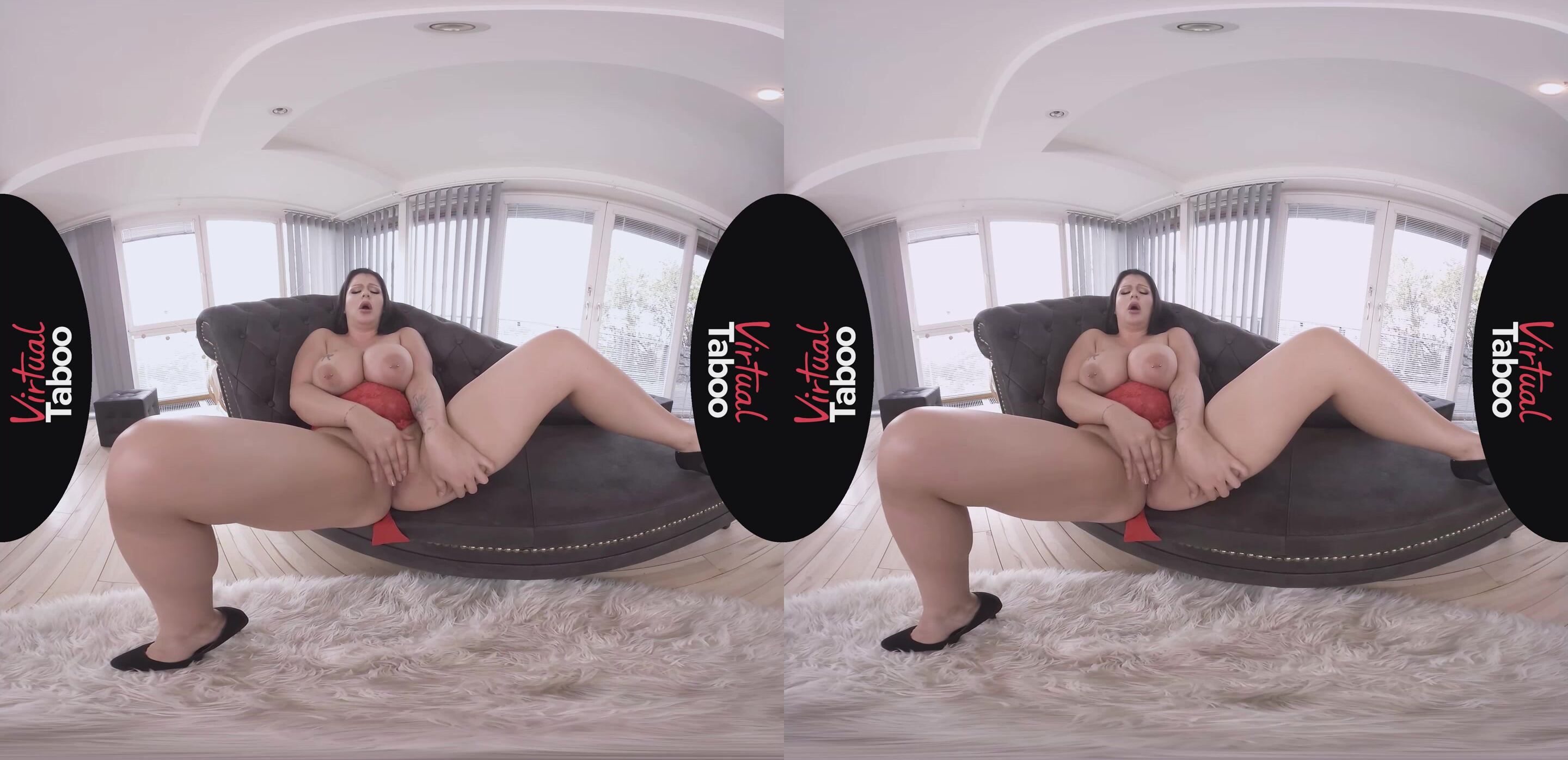 Since it was Anissa's and her boyfriend's anniversary, she decided to put on a surprise for him. For the special occasion, she put on a pair of sexy black high heels, and on the top, she put nothing but seductive red lingerie. She laid down on the black couch on the living room, waiting for her man, however, he did not show up. At one point, Anissa Jolie had enough, so she decided to take care of herself. It didn't take too long for her to remove the red lingerie, and as she did, her big knockers with pierced nipples busted out into the open. In order to turn herself on, this lusty princess started to fondle her big breast with her arms, and while doing so, she could feel pussy juicy oozing outside of her. Eventually she decided to advance to the next level, so as she kept fondling her big tits with one of her hands, she slid the other one down and she began rubbing her wet clit. The sensation of this pleasure caused Anissa to moan loudly, and thus her horny levels increased rapidly. As she kept getting hornier and hornier, she slowly inserted one of her fingers inside of her love tunnel, and before she knew, another one of her fingers got in. Anissa then rapidly continued to thrust her fingers inside of her nicely shaved taco, and she was about to reach her climax. While she was penetrating herself with her fingers, she screamed loudly in pleasure, and then she felt a nice wave of warm juices flowing over her fingers, finishing her solo session with one fantastic ending.