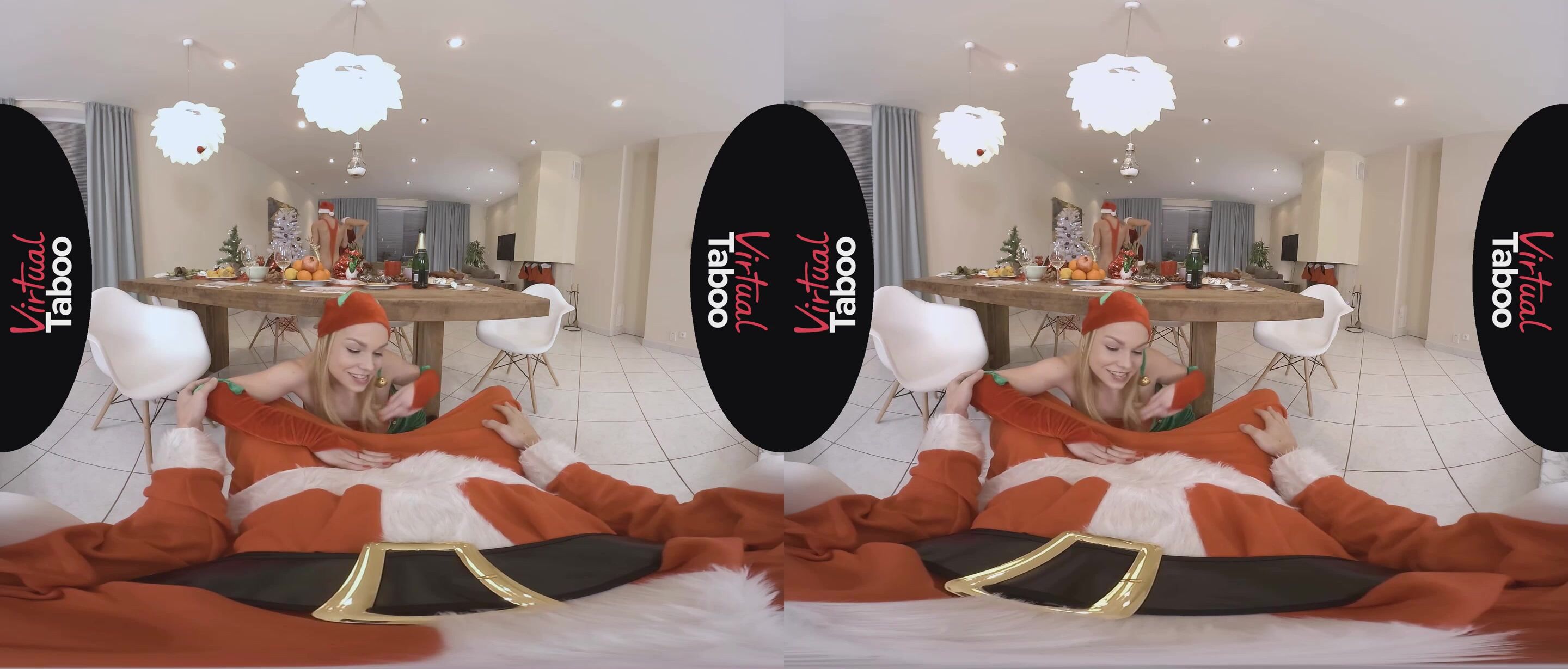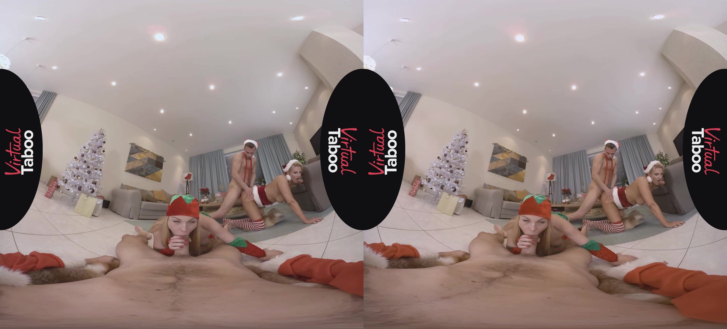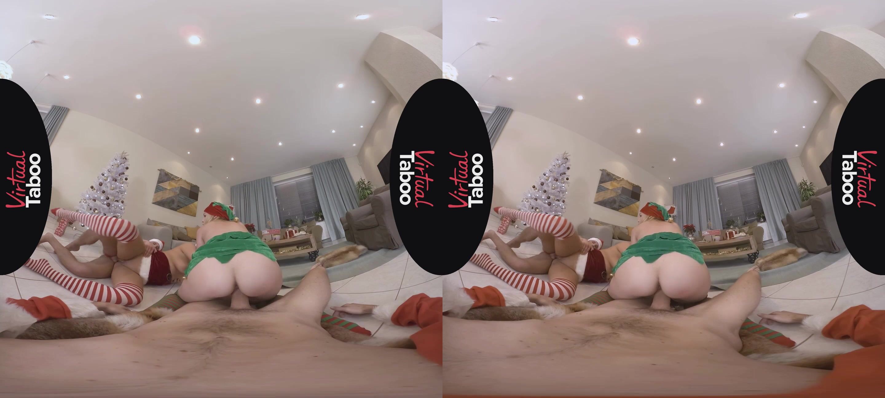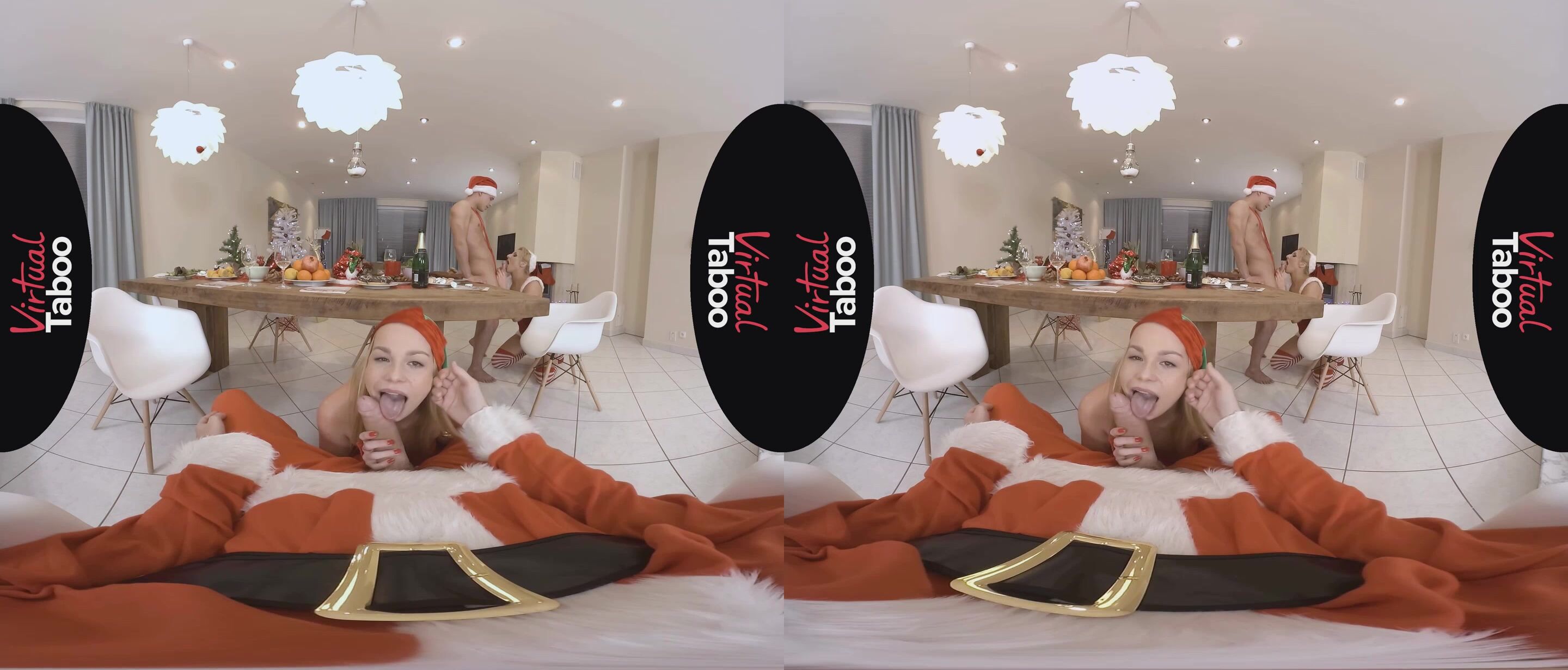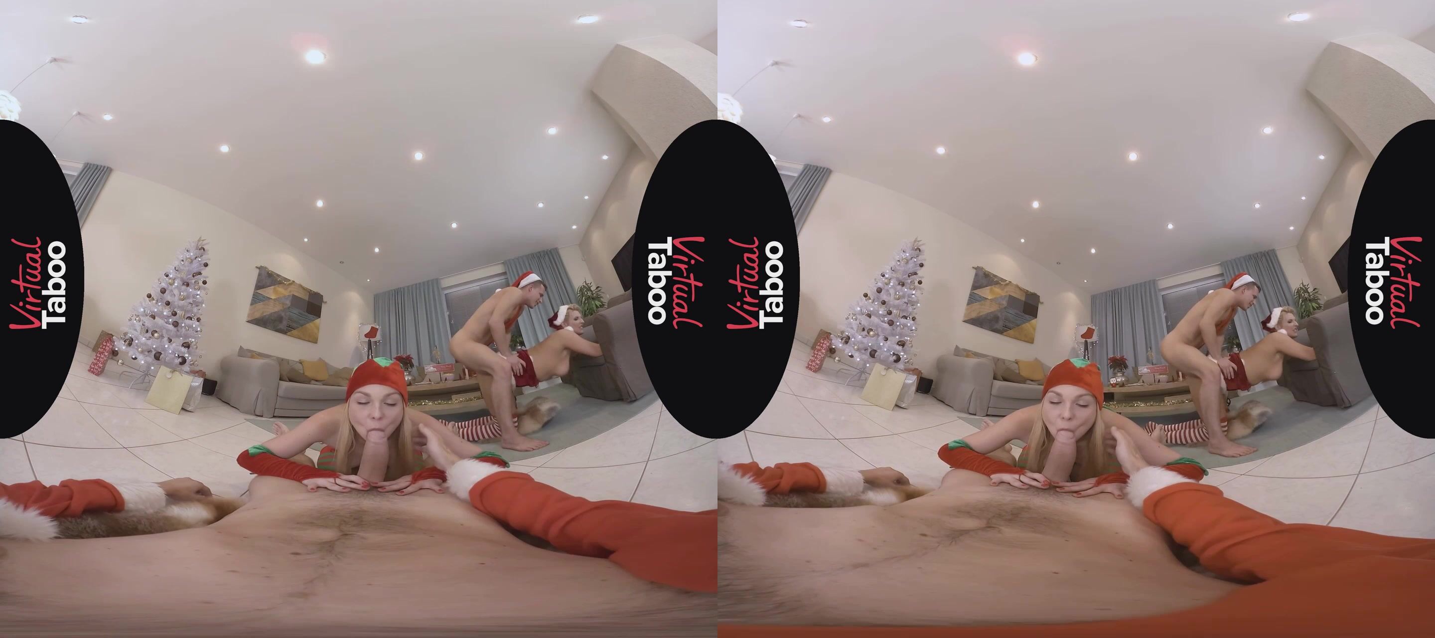 When this horny family gathers for the holidays there is always plenty to celebrate. From their beautiful Christmas tree to their festive outfits, the whole family is in the holiday spirit. While most of the family is happy to sit down to a delicious feast, son is just too excited about opening his gifts. He doesn't want to follow tradition and wait until morning. His loving stepmother has to take him aside and explain the rules to him. Taking advantage of some private time, horny blonde daughter Rebecca Black decides to give doting daddy his gift early. She crawls under the table and sucks on his big fat cock like a good girl. Big brother sees what Rebecca is doing and his package grows as well. Not to be left out, mom decides to let her son stop eating dinner and eat her pussy instead. She also shows daughter how it's done by delivering a naughty blowjob to son's throbbing cock. Rebecca climbs on top of daddy's dong and takes a slutty sleigh ride on his north pole. Rebecca follows mommy's lead and helps her double up while sucking off daddy. This leaves her stepbrother free to plow her tight young pussy from behind. The horny blondes ride the big dicks until the men shoot hot streams of sticky cream into their willing mouths. No holiday celebration is complete with loving moms and dads spoiling sons and daughters. This happy family is drained and ready for a long winter's nap.