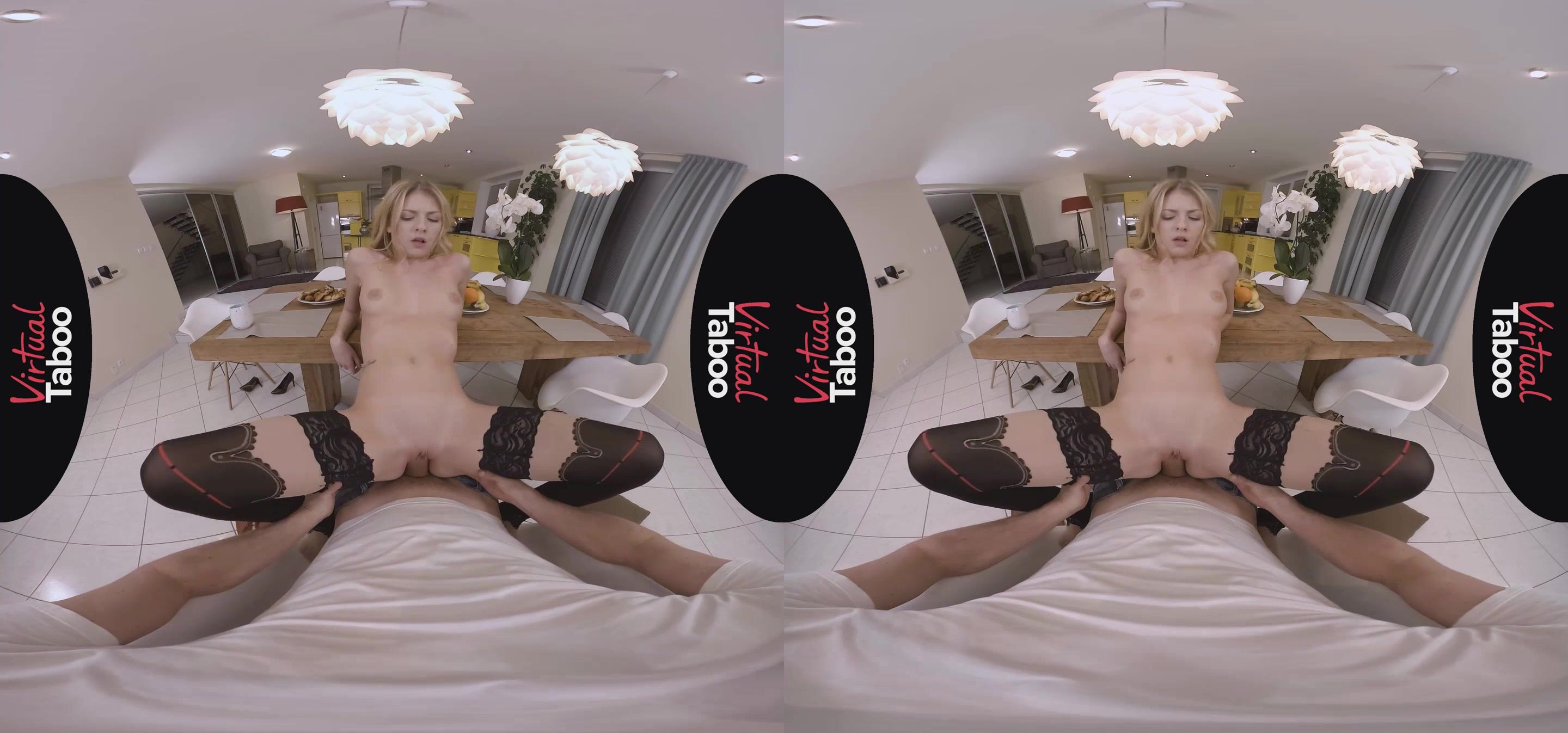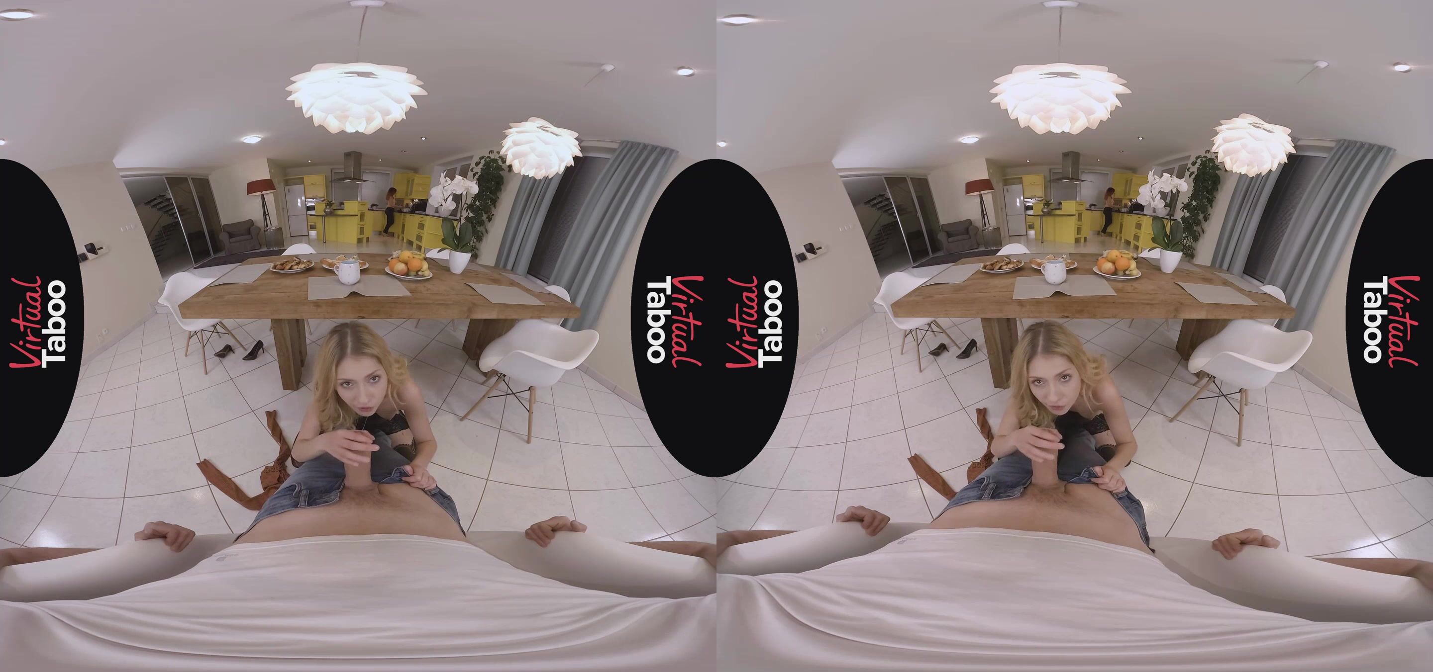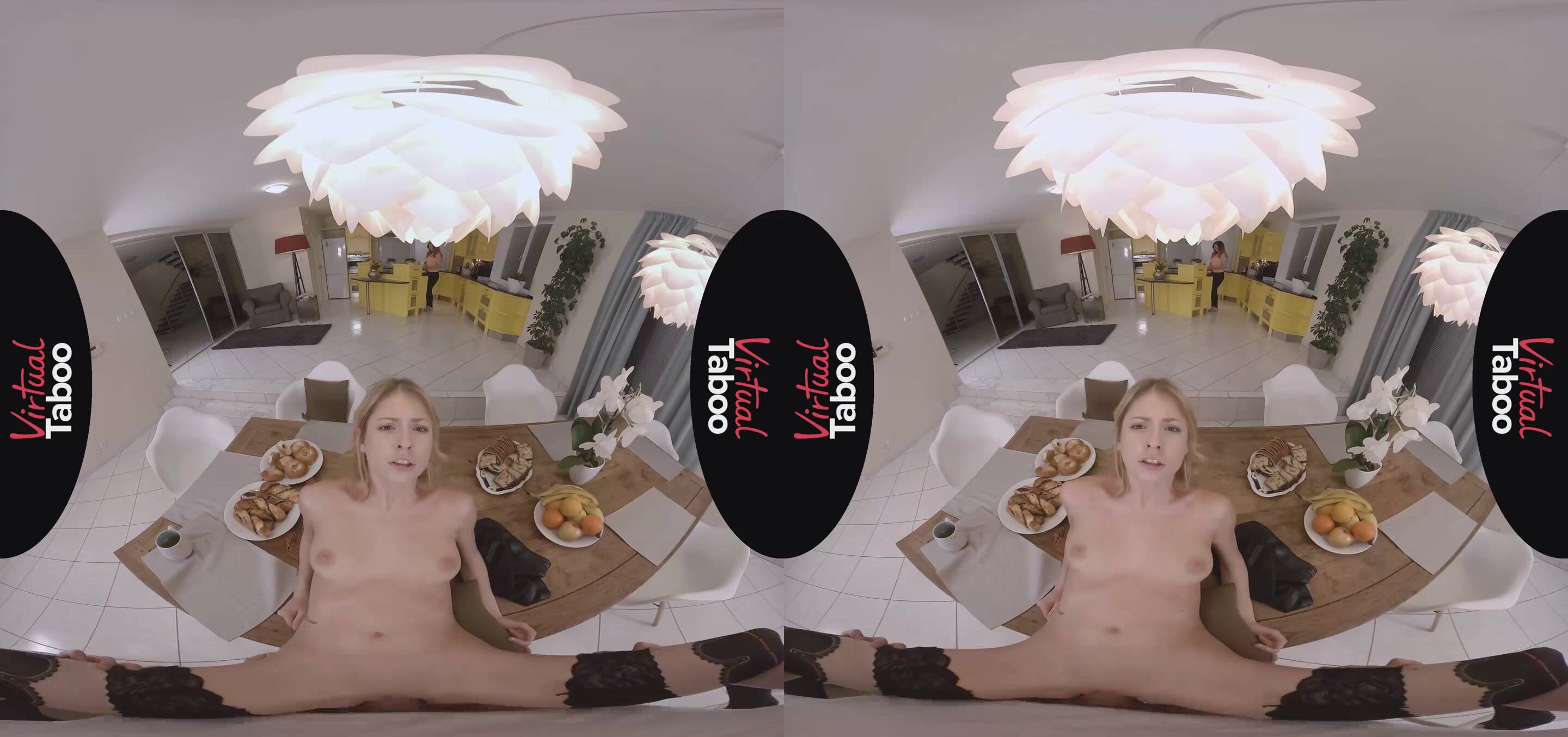 Life is good for Rebecca Volpetti's stepbrother. He is enjoying some hot tea and breakfast on a cold winter morning, minding his own business and relaxing with his thoughts. His sexy stepsister and her gorgeous friend join him before they go out shopping. While he chats up her friend, Rebecca immediately starts teasing him, suggestively eating a banana, rubbing her high heeled shoe against his crotch and blatantly flashing her bare pussy at him. With her friend just a few feet away, Rebecca sneaks under the table and starts sucking his big hard cock. Her friend doesn't notice and continues to talk to him while his hot, blonde stepsister gives him a greedy blowjob. Unable to resist, Rebecca sits on her stepbrother's lap and lets him slide his fat cock into her tight young pussy. Sitting just across the table, her friend even feeds her pastry without noticing the dirty fucking going on right in front of her. When her friend gets up to make more tea, Rebecca takes advantage, losing the rest of her clothes and begging her stepbrother to bang her right there on the table. His big dick fills her tight hole perfectly with every stroke and she loves every inch as he pounds her mercilessly. They try to finish up before Rebecca's friend gets back from the kitchen, but he cums a huge load on her shaved pussy just as the brunette returns. Caught, the horny siblings make her promise not to tell anyone what she saw.