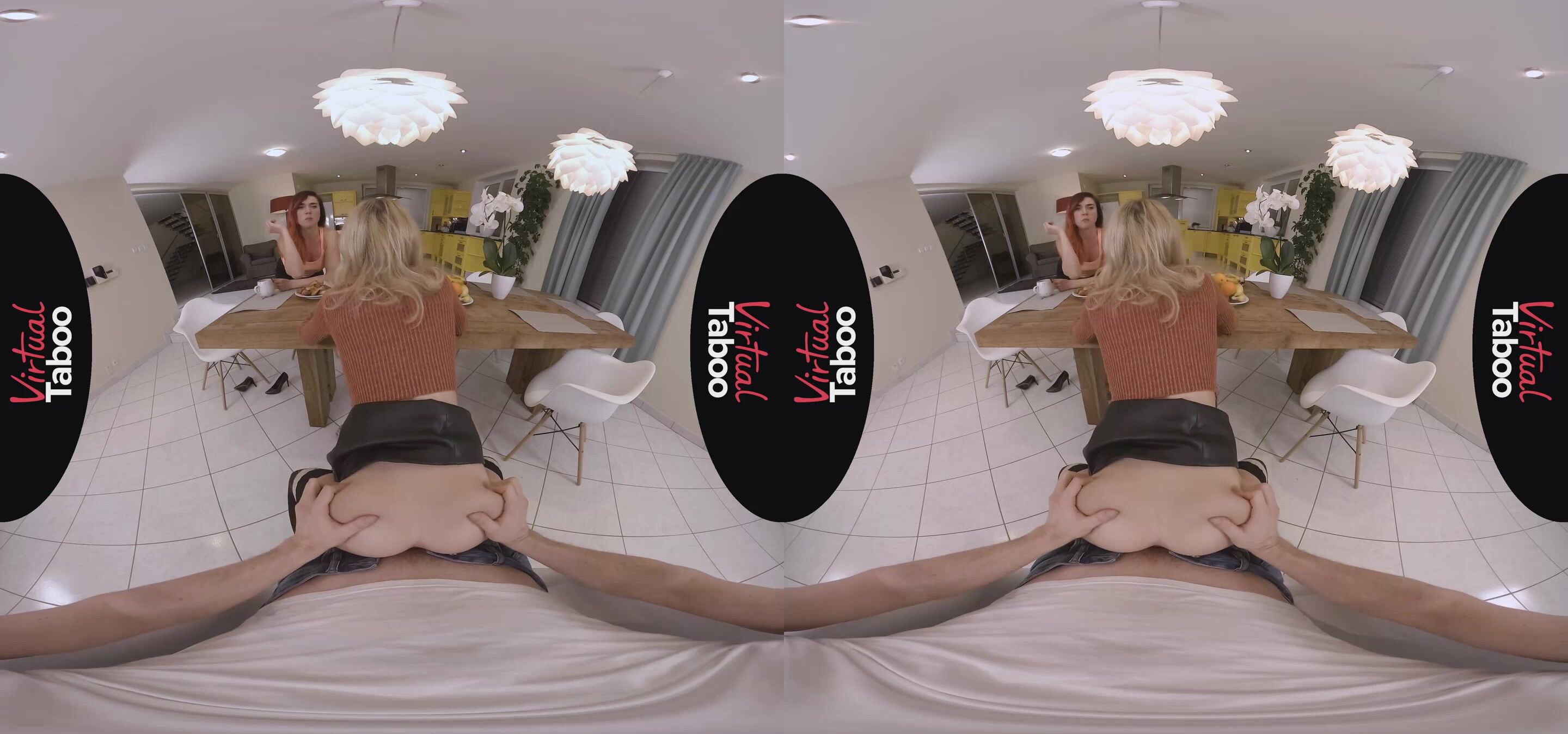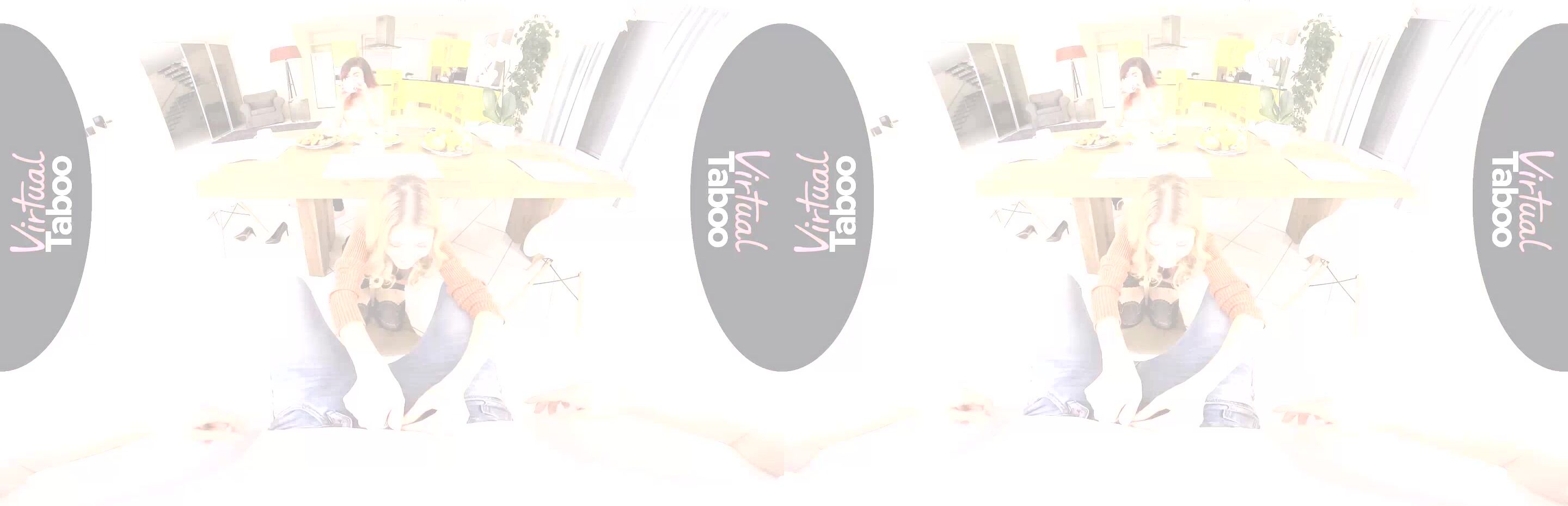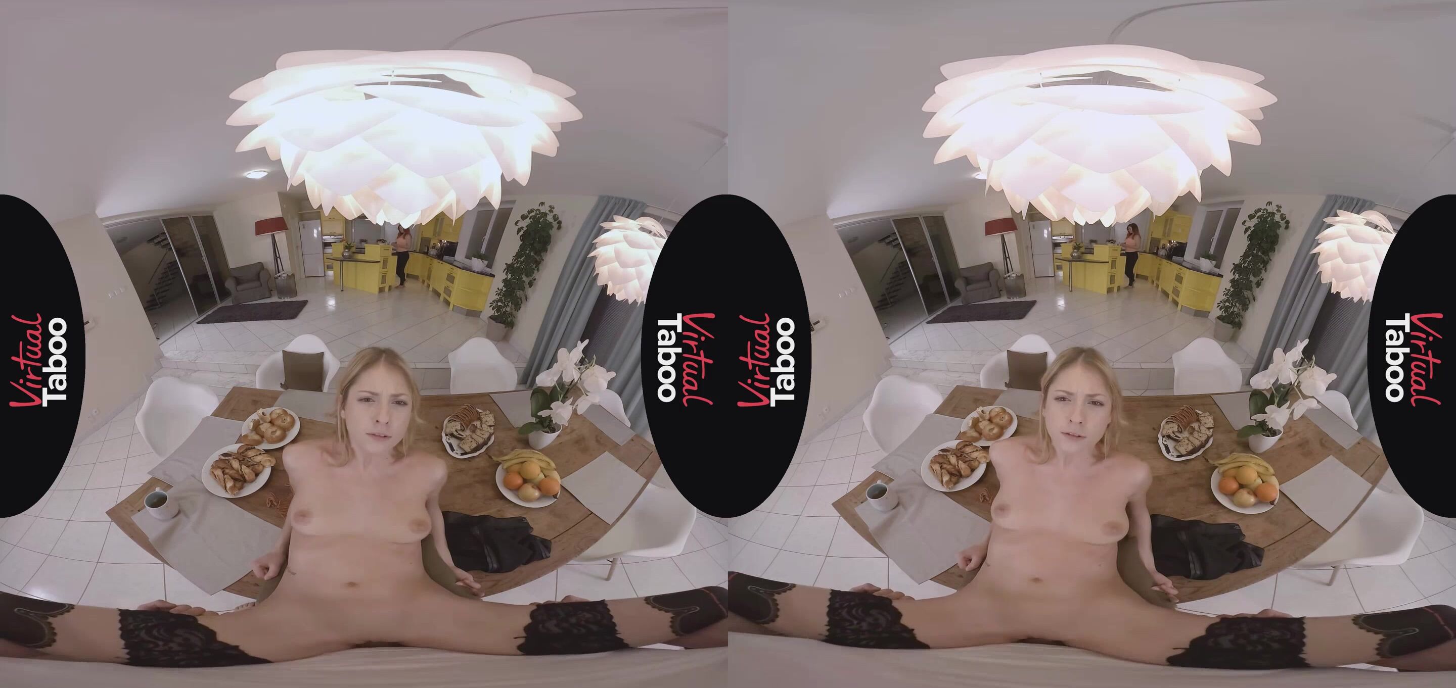 Life is good for Rebecca Volpetti's stepbrother. He is enjoying some hot tea and breakfast on a cold winter morning, minding his own business and relaxing with his thoughts. His sexy stepsister and her gorgeous friend join him before they go out shopping. While he chats up her friend, Rebecca immediately starts teasing him, suggestively eating a banana, rubbing her high heeled shoe against his crotch and blatantly flashing her bare pussy at him. With her friend just a few feet away, Rebecca sneaks under the table and starts sucking his big hard cock. Her friend doesn't notice and continues to talk to him while his hot, blonde stepsister gives him a greedy blowjob. Unable to resist, Rebecca sits on her stepbrother's lap and lets him slide his fat cock into her tight young pussy. Sitting just across the table, her friend even feeds her pastry without noticing the dirty fucking going on right in front of her. When her friend gets up to make more tea, Rebecca takes advantage, losing the rest of her clothes and begging her stepbrother to bang her right there on the table. His big dick fills her tight hole perfectly with every stroke and she loves every inch as he pounds her mercilessly. They try to finish up before Rebecca's friend gets back from the kitchen, but he cums a huge load on her shaved pussy just as the brunette returns. Caught, the horny siblings make her promise not to tell anyone what she saw.