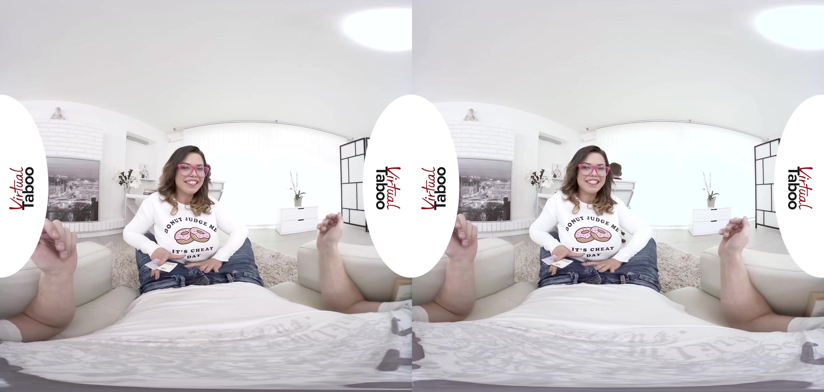 When Chloe, a bespectacled co-ed hottie with massive boobs, came back from college, she found her stepbro playing a video game on his laptop and her stepfather reading a book. All of a sudden, our lovely Chloe felt a bit naughty and decided to flirt with her step dad before actually asking him for some money. Setting her cushiony booty in his lap, his stunning stepdaughter knew exactly what she was doing, as her daddy developed a boner by the warmth and proximity of her curvy body, as well as by just looking at her. Caving in, the dad provided a certain amount of money from his pocket, but stacked Chloe was not impressed with it. Wanting more cash, she started searching through his pockets only to find his pulsating and hard member. Feeling the pangs of horniness clutching at her tight belly, the kinky stepsister turned around to check out what her bro was doing before whipping out her stepdaddy's fat prick and stuffing it in her mouth. After sucking his massive dick for a while, Chloe pulled up her shirt and put it between her large tits for a quick boobjob before going on to blow on it some more. But, it was then that her stepbrother lost the match he was playing, closed the laptop lid, and turned around only to witness his father enjoying a taboo blowjob from his hot stepsis. Naturally, he was shocked and started saying how all of this was wrong, but the lusty step sister used her wily charms and managed to convince him to join them. It was then that his stepfamily turned to some taboo antic as Chloe took turns sucking her daddy's and her bro's cocks before letting them take off her clothes and unveil her voluptuous body in its entirety, ripping off her white panties in the process. Step brother took the first move by pounding his stunning stepsister's dripping wet pussy from behind as her lips were wrapped around his dad's giant schlong. Then, it was stepdad's turn and fantastic Chloe decided to ride on his stiff pecker in the reverse cowgirl position as she serviced her stepbro's meat pole in an oral fashion. The two guys then took turns ramming this curvaceous cutie from behind and having her bounce on their thick shafts. During all of this Chloe squirted several times, coating herself, the father and the son, as well as her surroundings in her pussy juice. At the very end, kinky Chloe had her hung step bro cover her pretty face and pink glasses in cum before letting her horny step daddy shower her giant boobies with his sticky sperm.