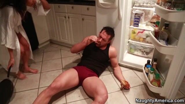 Gigi Loren hears something in the kitchen, and when she goes to investigate, she finds a man in her refrigerator, so she hits him with a frying pan! Turns out it's Johnny, her husband's friend, who tells her that he's raiding her their fridge because his girlfriend has gone vegan and there's no real food in the house. Gigi laughs off the lump she gave him, but she doesn't want him to leave because she wants to fuck him while her husband is sleeping! Johnny figures that since he took a pounding from the sexy Latina, he can give her one!
